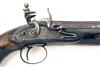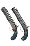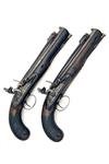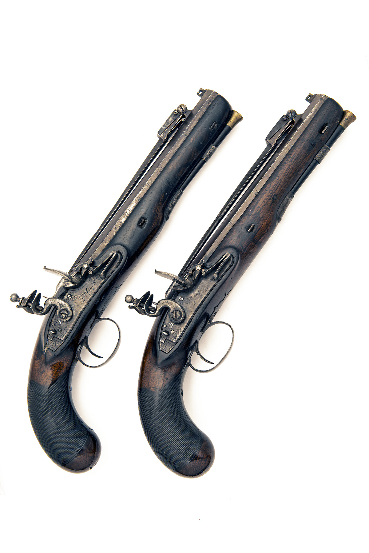 circa 1800, with octagonal 8 5/8in. barrels, the top-flats signed in script 'D. EGG, LONDON (rubbed), concave faced triangular cross-section iron bayonets mounted to the barrels with tang release, slightly curved flat bevel-edged locks signed 'D. EGG', stepped tails, sliding safes behind the cocks, semi-rainproof pans, roller frizzens, walnut full-stocks with chequered bag-shaped butts, iron furniture and brass tipped mahogany ramrods