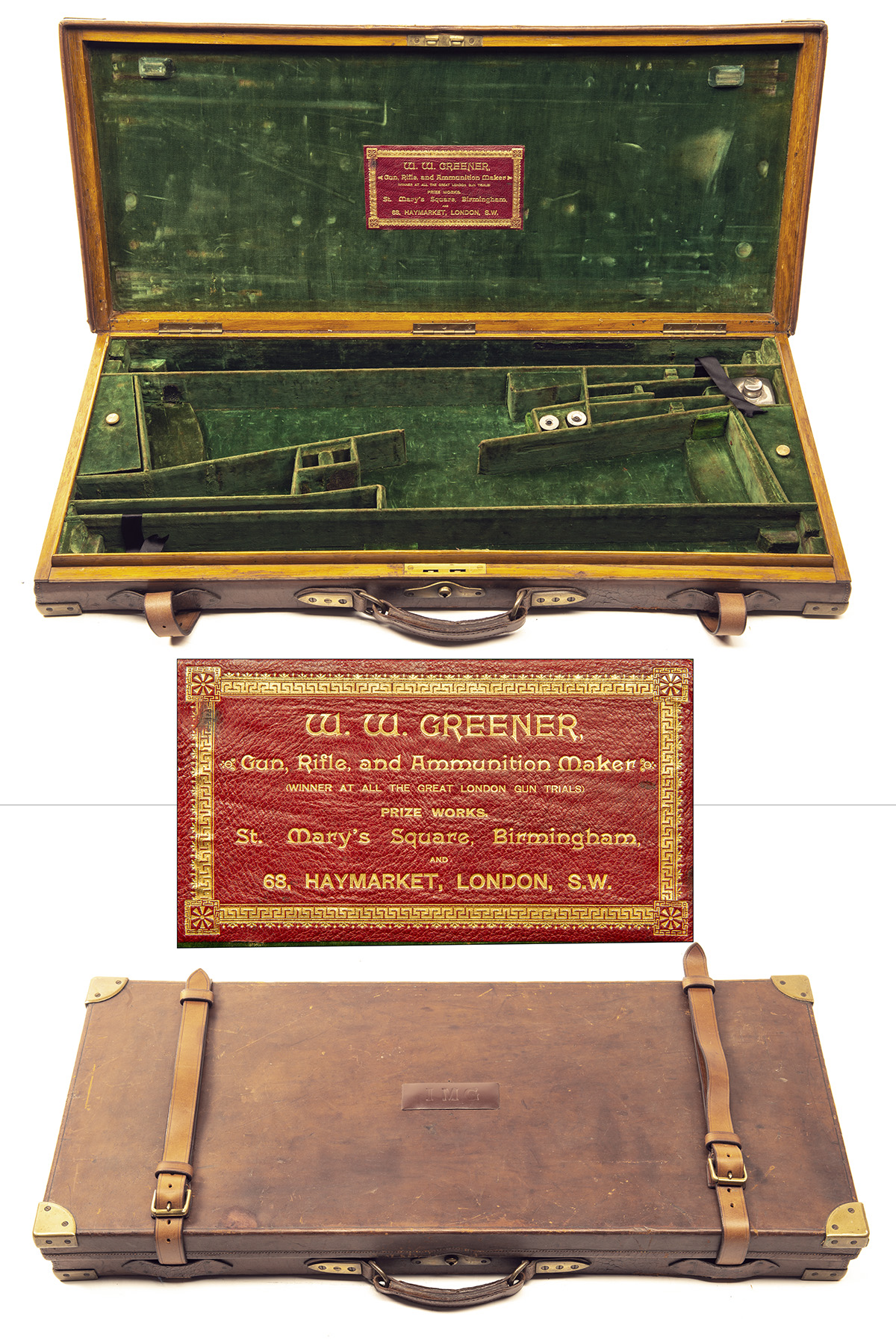 W.W. GREENER A BRASS-CORNERED OAK AND LEATHER DOUBLE GUNCASE,