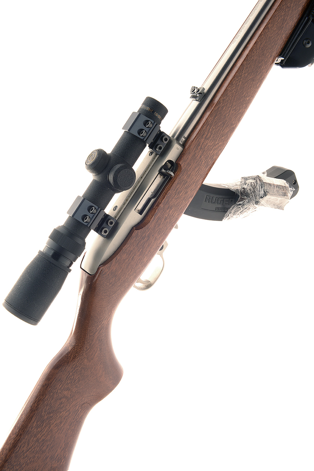 RUGER .22 L.R. 'MODEL 10/22' SELF-LOADING SPORTING RIFLE, serial no. 247-41350, 18 3/4in. stainless nitro barrel, threaded for sound moderator, block-mounted bead fore-sight, folding leaf rear-sight, fitted with a Simmons 1.5-5x20 telescopic sight, manual safety, detachable banana magazine together with standard detachable magazine, 13in. stock