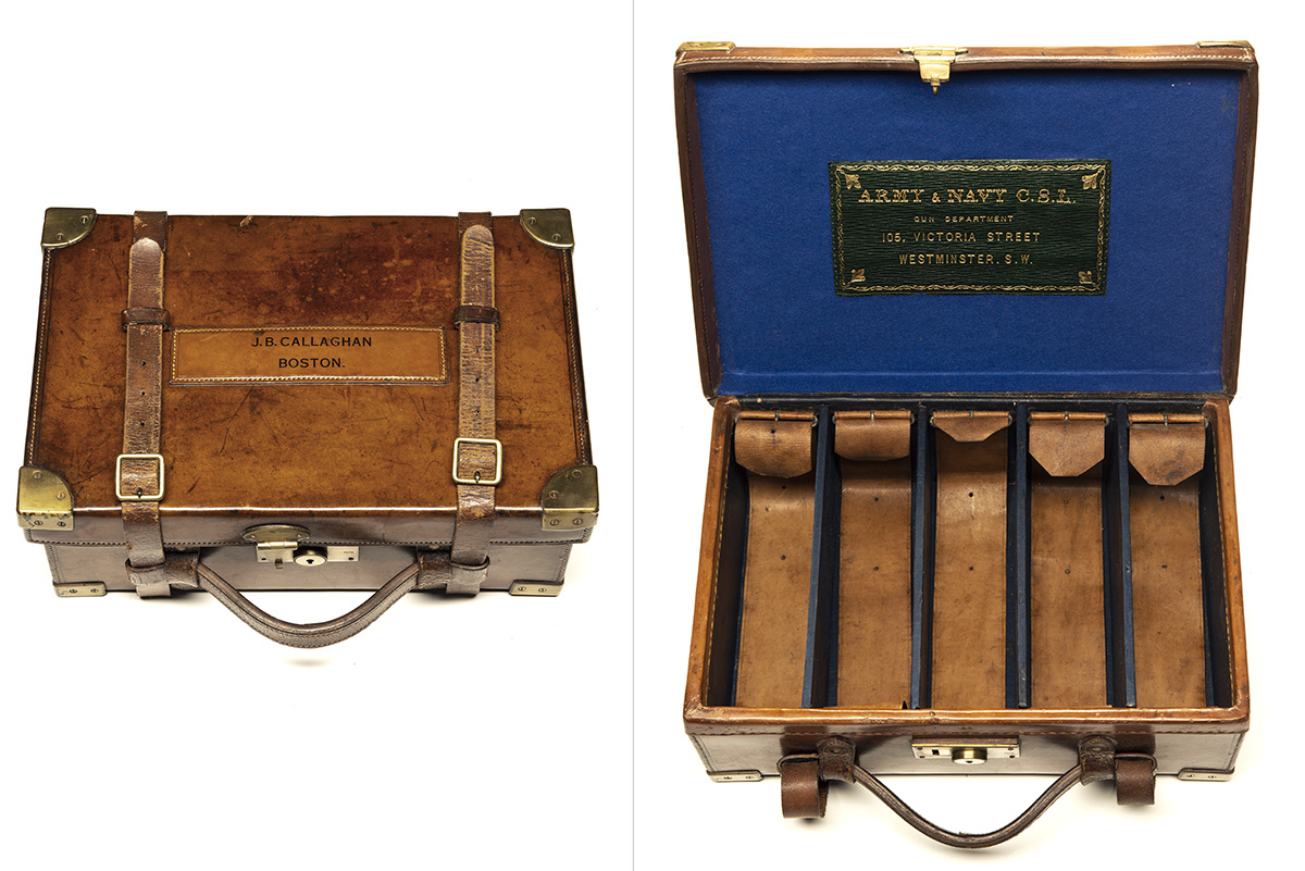 for approx. 250 cartridges, five leather lifters, the lid interior re-lined in blue baize and with a gold-tooled Army & Navy C.S.L. leather trade label