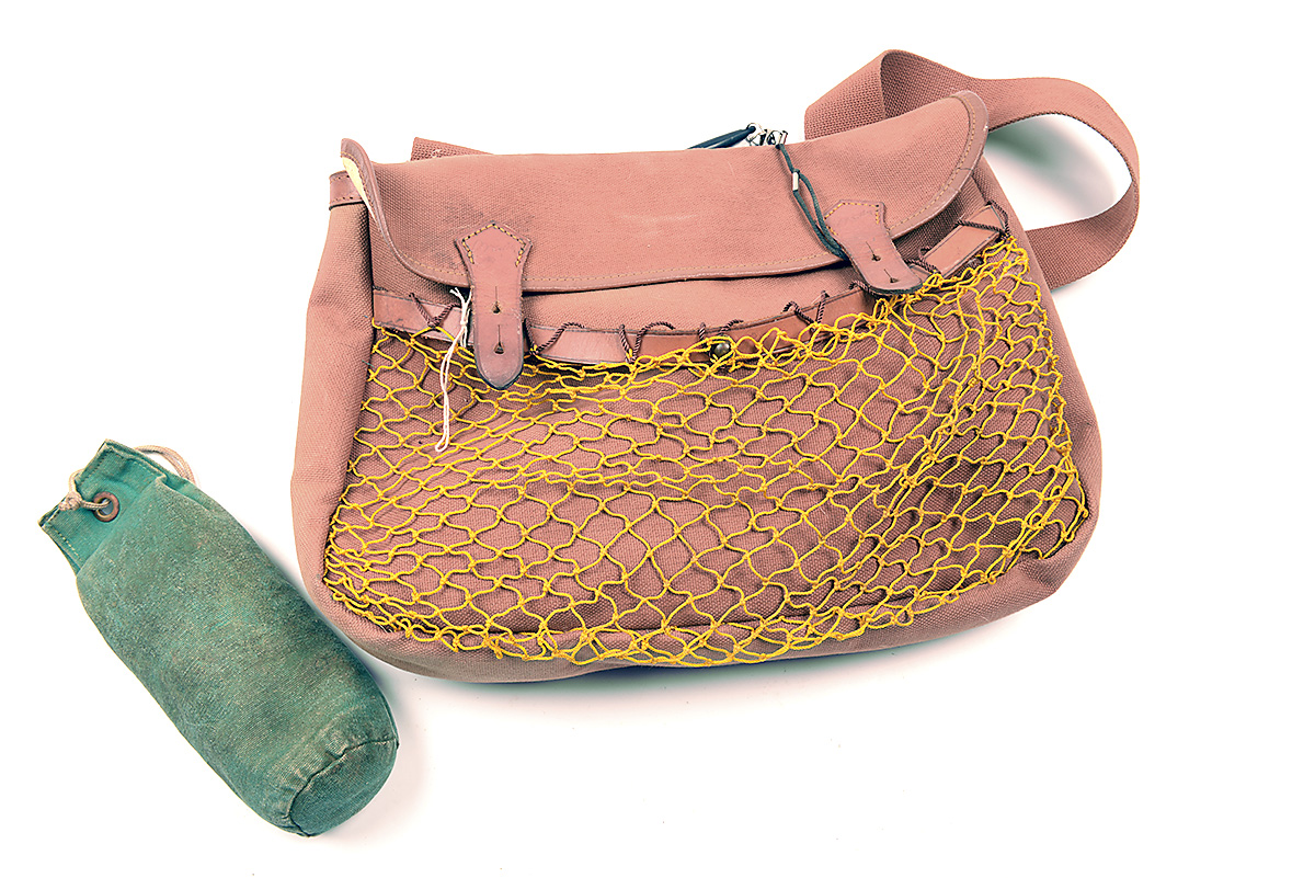 A COLLECTION OF THREE LEATHER CARTRIDGE BAGS TOGETHER WITH A CANVAS AND LEATHER GAME CARRIER together with whistles and 4 x lures