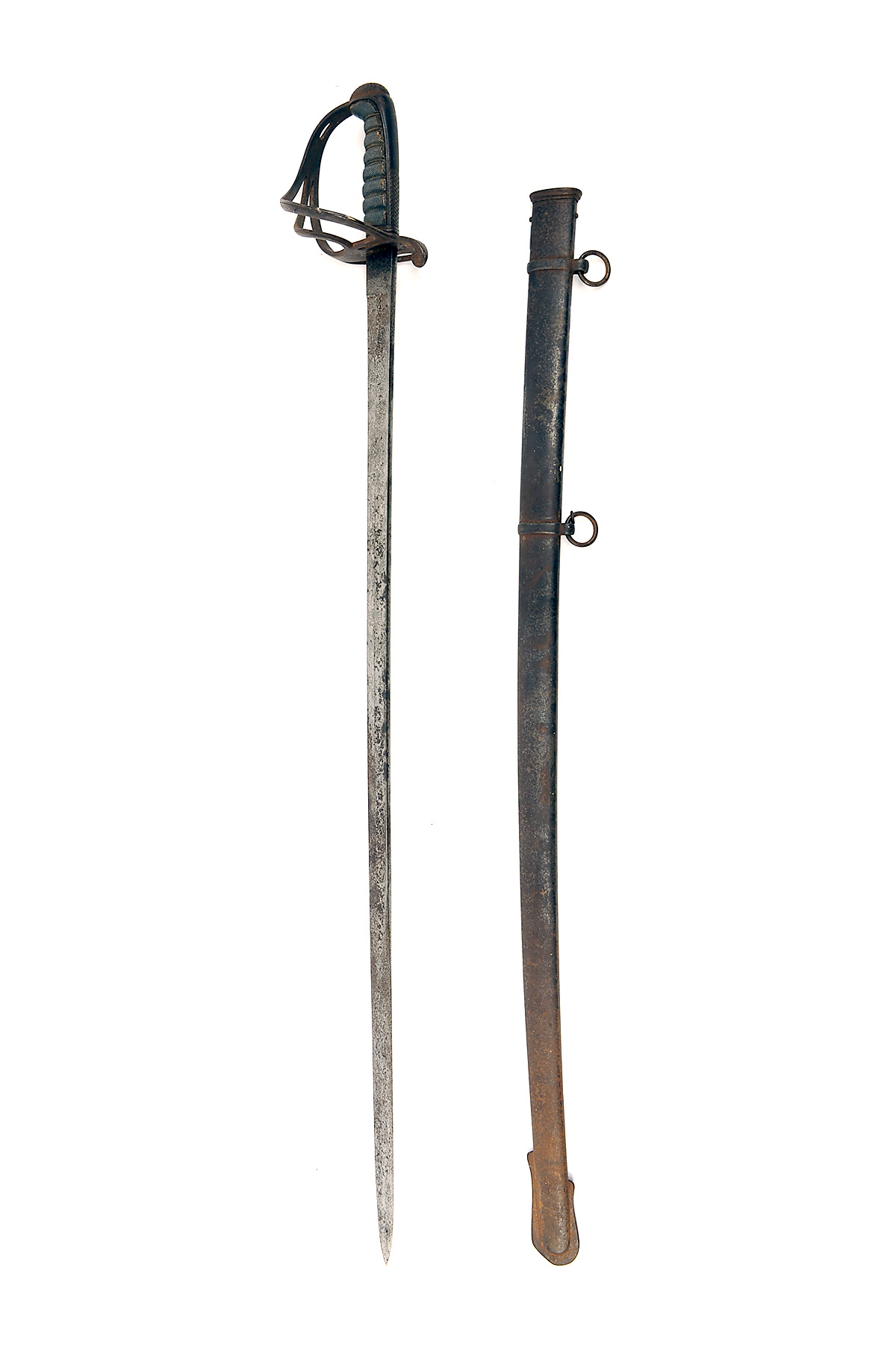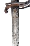 A BRITISH PATTERN 1821 LIGHT CAVALRY SABRE SIGNED JOHNSTON, LONDON FOR THE XVIII HUSSARS, circa 1870, with 35 1/2in. slightly curved Wilkinson style proved blade (some staining and corrosion), etched with scrolls and arabesques and featuring the XVIII Hussars regimental device, iron three-bar hilt, sharkskin wire-bound grip, moulded back-strap and chequered pommel, complete with its iron scabbard (darkly stained)