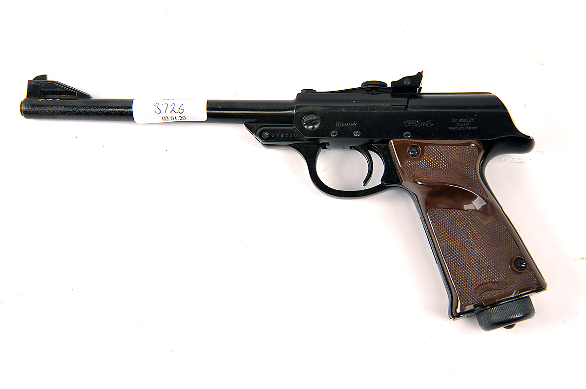 A BOXED .177 BARREL-COCKING AIR-PISTOL SIGNED WALTHER, MODEL 'LP53', serial no. 014226, with 9 1/2in. sighted barrel, scarce smooth finish variant receiver, blued frame and chequered brown plastic grips, in its maker's carton with cleaning rod