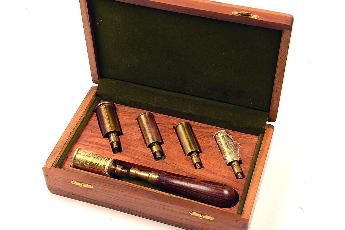 A PRESENTATION BRASS AND OAK CHAMBER BRUSH CLEANING KIT,