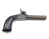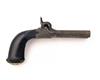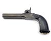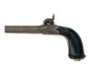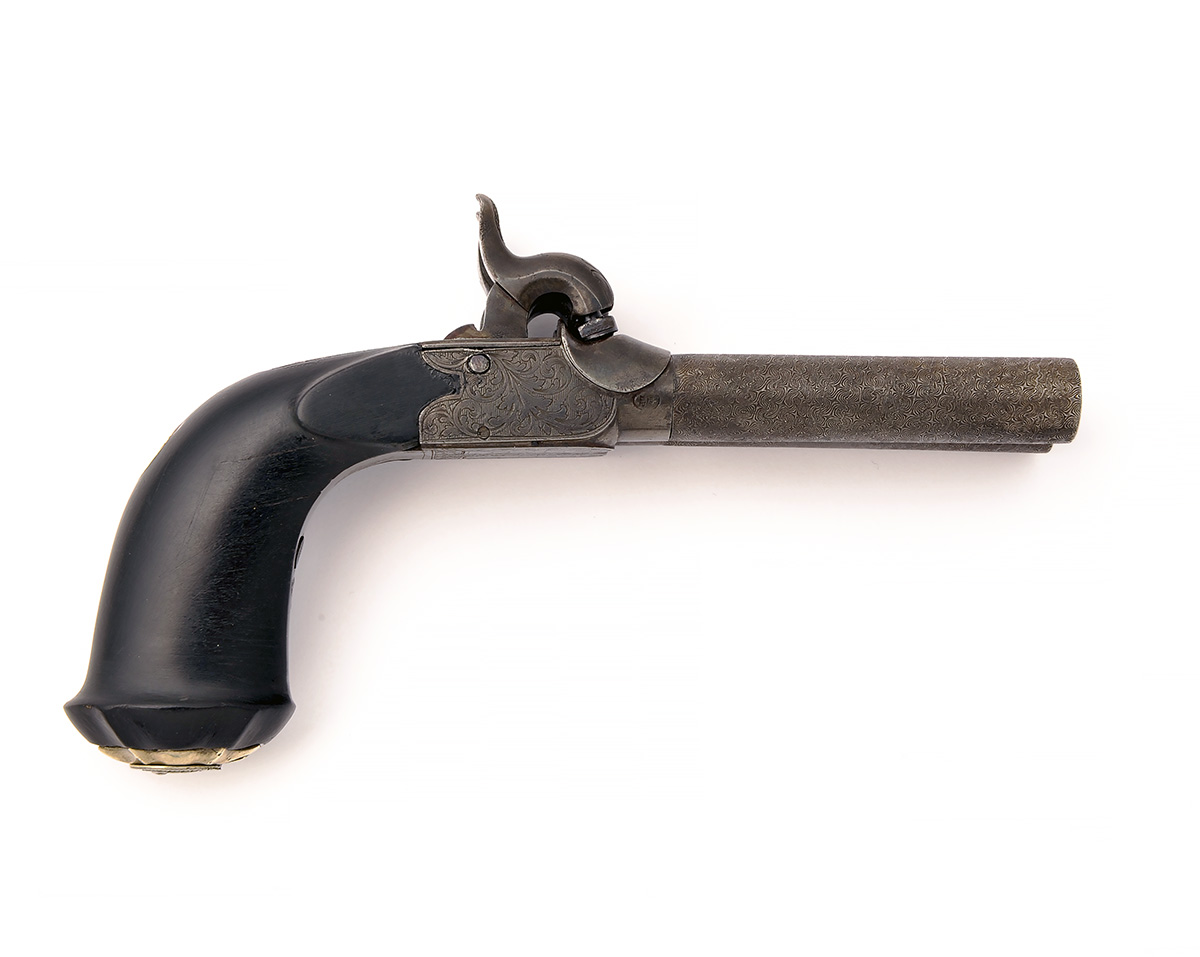 A 40-BORE PERCUSSION DOUBLE-BARRELLED BOXLOCK POCKET-PISTOL, UNSIGNED, no visible serial number, Belgian, circa 1835, with etched damascus 3in. turn-off round barrels with false rifling at muzzles, squared border and foliate engraved boxlock action with twin central hammers and twin concealed automatic triggers (top-tang nail replaced), smooth ebony grip (blind hairline cracks) with flared pommel mounted with a scallop bordered white metal mount and central lion's mask trapdoor and white metal oval escutcheon to wrist