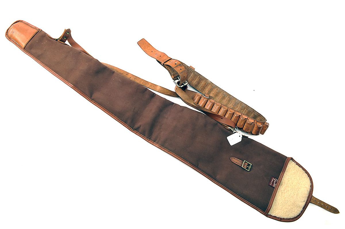 A CANVAS AND LEATHER FLEECE-LINED SINGLE GUNSLIP TOGETHER WITH A LEATHER 12-BORE CARTRIDGE BELT