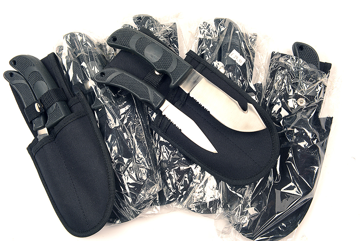 A COLLECTION OF SIX UNUSED SET OF DOUBLE SKINNING / HUNTING KNIVES, (6)