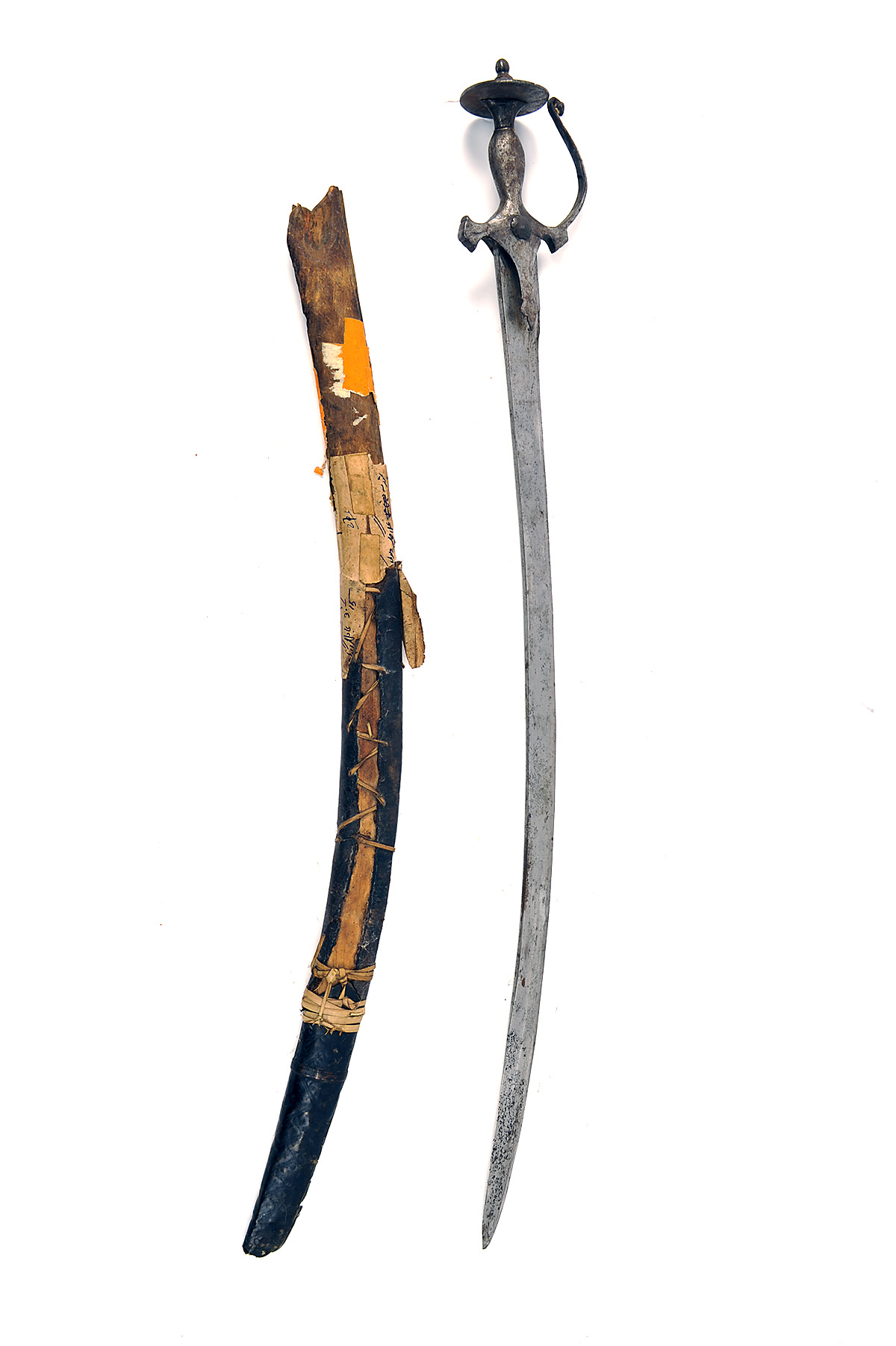 AN INDIAN ALL STEEL TULWAR SWORD, late 19th century, with 30in. slightly curved blade, guarded hilt with disk pommel and remnants of its goatskin covered wood scabbard