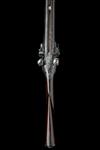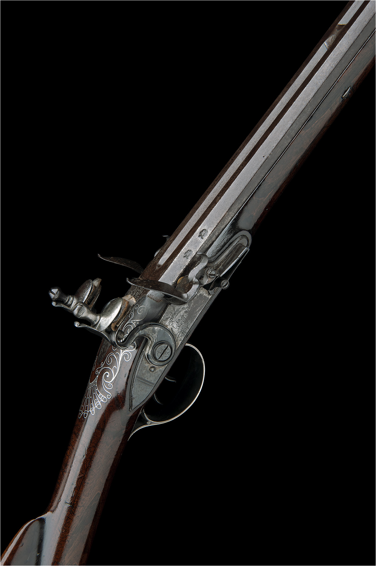 circa 1770, with unusual semi ribless half round, half octagonal 39 1/4in. barrels, the octagonal breech-ends signed on the top-flats 'JAMES SCOTT' on the left and 'CANONGATE EDIN'R' on the right, moulded bands at the intersection, applied silver boat-shaped fore-sight, acanthus scroll engraving to breech, private proofs, gold lined touch-holes, broad slightly humped acanthus and border engraved top-tang, flat, slightly curved bevel edged step tailed locks signed 'JAS SCOTT' within a border of trophies and foliage, plain pans and frizzens, French style cocks (one repaired and top-jaw replaced), walnut half-stock with handrail grip, silver wire inlay forming an apron around the top-tang and heel-plate spur, engraved silver ribbon border to the butt-end, toe and around the top heel-screw (wood chipped at toe), hallmarked cast and engraved trigger-guard bow and tang with vase finial, broad silver hallmarked fore-end tip bored for ramrod, twin escutcheonless barrel keys, moulded silver ramrod thimbles and possible period wood ramrod