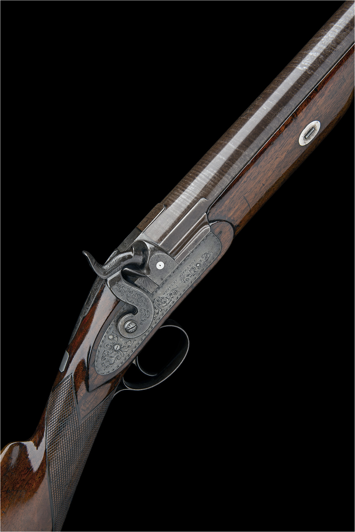 for 1840, with substantial heavy round tapering twist-iron 42 1/2in. barrel, bead fore-sight, the top of barrel signed 'WESTLEY RICHARDS & CO. 170 NEW BOND ST. LONDON' within an engraved needle terminating in a scroll engraved flourish, octagonal breech-block with moulded nipple boss and carved short side and top-ribs, the top of breech engraved with a goose in flight, borderline and scroll engraved top-tang with carved sighting groove, border and scroll engraved bar-action lock signed 'WESTLEY RICHARDS', borderline and scroll engraved dolphin headed hammer, heavy walnut half-stock chequered at the wrist, iron heel-plate, single escutcheoned barrel key and heavy duty brass-tipped ebony under-barrel ramrod in plain thimbles