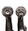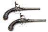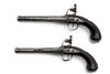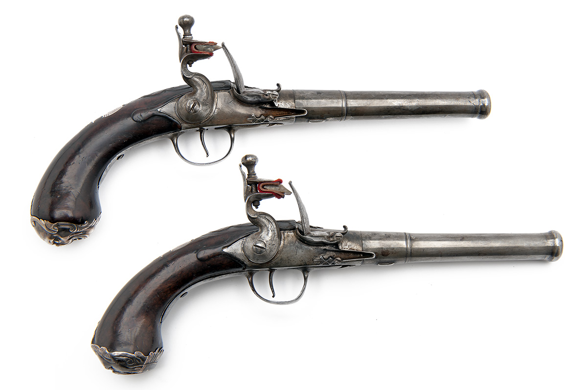 circa 1760 and possibly signed for 'JOHNSON, LONDON', with 5 1/4in. turn off cannon barrels, traces of scroll engraving and London proofs at breech, borderline engraved radiused action bodies with applied top-tangs with feathered terminals, traces of engraving and moulding to the frizzen fronts, borderline engraved circular top-jaws, walnut grips swelling at the pommel and mounted with white-metal grotesque mask butt-caps (one dented), carved aprons around the top-tang, complex white metal escutcheons engraved with a wreathed arm holding a sword vertically aloft surrounded by the motto 'NE PARCAS NEC SPERNUS' (have no mercy and scorn), moulded trigger-guard bows, pierced white-metal side-plates and iron belt-hooks