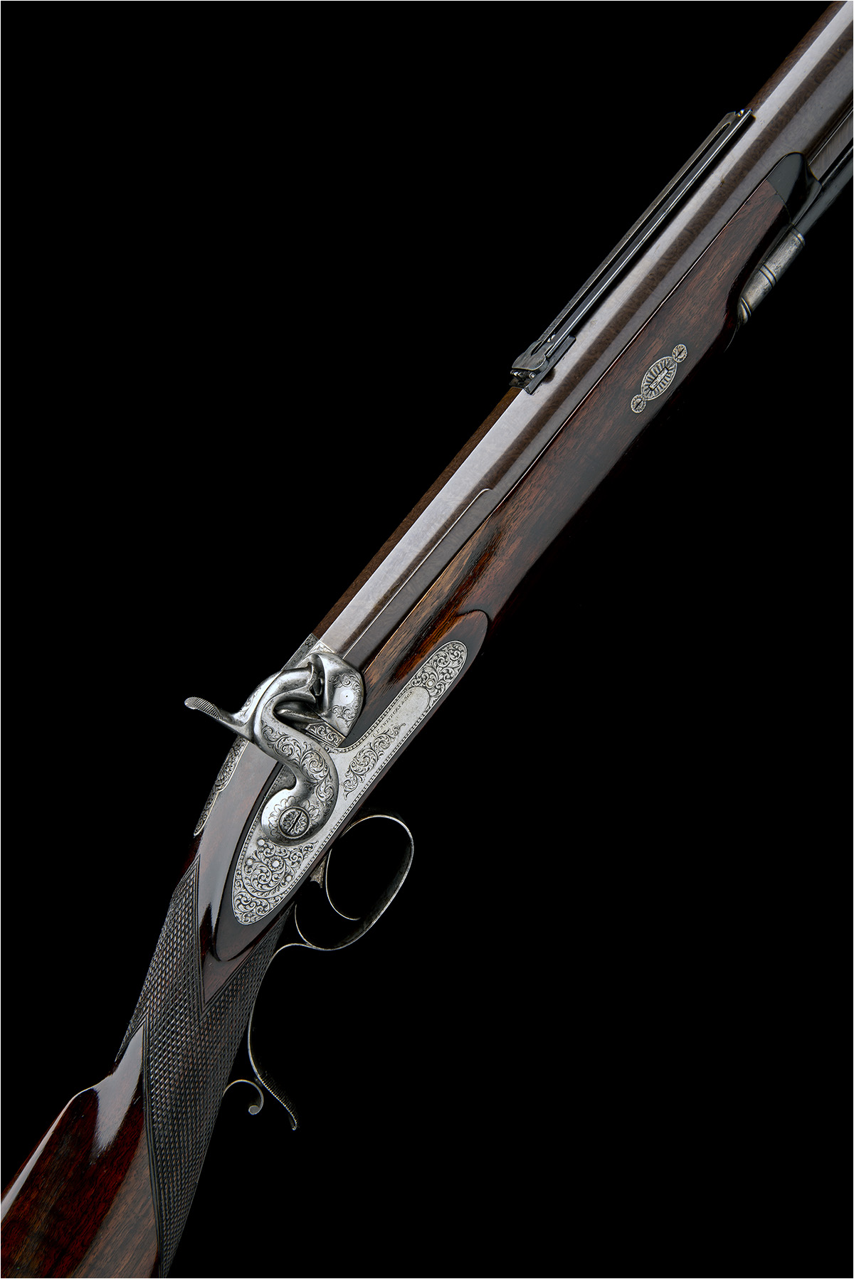 circa 1855, with heavy round damascus re-browned 30in. barrel, the breech-end of barrel with short flat sighting plane signed 'C.P. SWINBURN & SON, MAKERS, BIRMINGHAM' terminating in a long ladder sight of 'Jacob' design graduated to 1600 yards, elongated bead fore-sight, squared patent breech with platinum vent and engraved with borders and scrolls around a central depiction of a tiger's mask to the top, fully engraved top-tang, border and scroll engraved brushed bright lock signed 'C.P. SWINBURN & SON', carved and engraved dolphin-mouthed hammer, walnut half-stock chequered at the wrist (some repairs to fore-end), the left hand face of butt marked '23' over 'B.P.' (possibly a rack number), engraved iron furniture including large patchbox featuring a prowling lion, chequered spur to the lower tang, engraved trigger-guard bow with plain trigger, engraved ramrod throat, plain thimbles and original heavy duty ebony ramrod with brass mounts, in a period walnut case adapted, compartmented and re-lined in blue baize for this rifle and containing two gilded bullet moulds, a leather covered flask, oil bottle, patch pot, loading funnel and sundry accessories, some possibly associated
