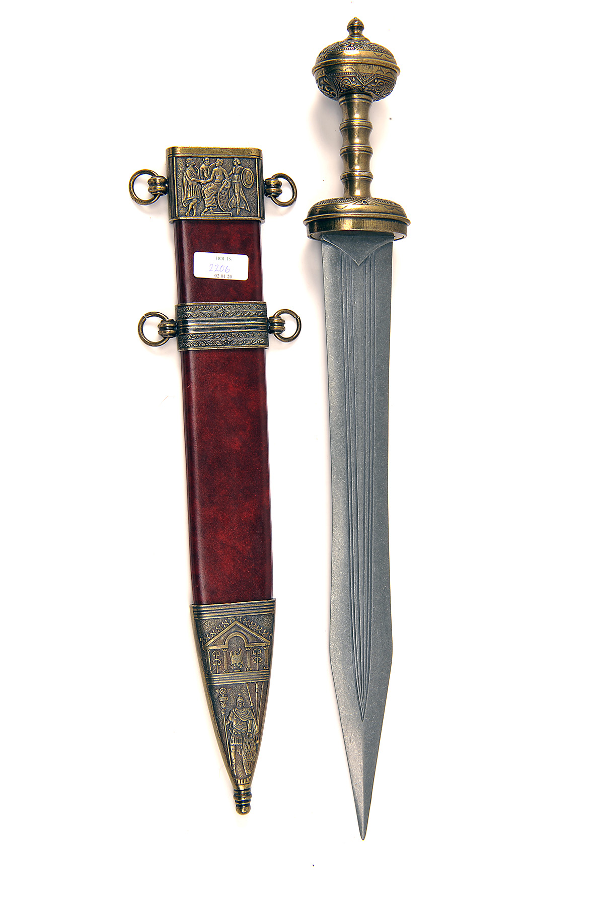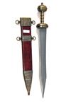 A REPRODUCTION ORNATE ROMAN GLADIUS, with 20 1/4in. display only blade, brass finish to the decorated hilt and complete with its dark red imitation leather scabbard with embossed brass coloured mounts