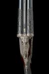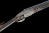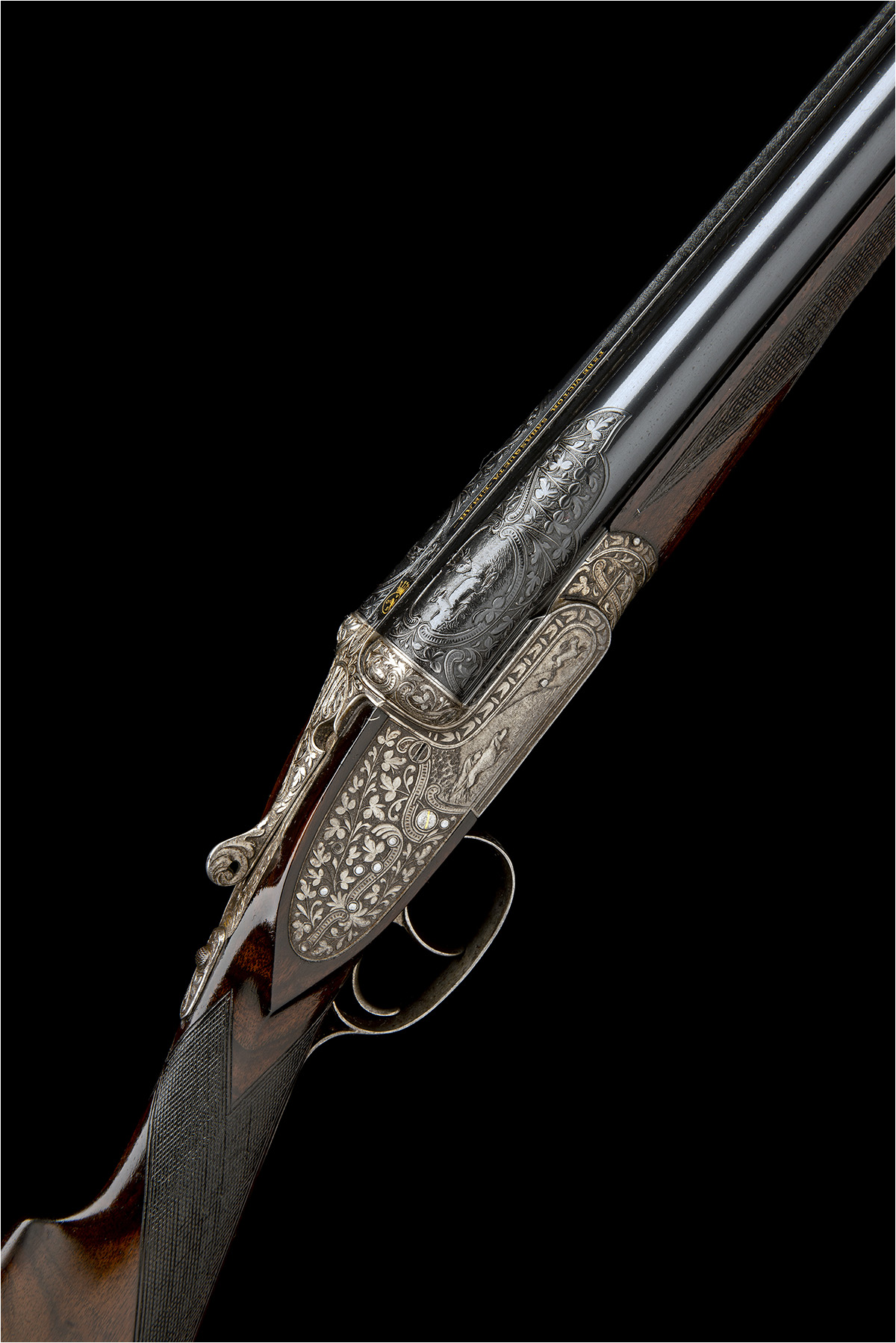 treble-grip action with hidden third bite, removable striker discs, pierced toplever, automatic safety with gold-inlaid 'S' detail, gold-inlaid cocking-indicators, articulated front trigger, the action, lockplates and furniture deeply carved with flowing foliate and ribbon motifs, surrounding carved vignettes of hound and fowl to the right, hound chasing hare to the left, the underside with a lion astride a lioness, the triggerguard with wildfowl, bright finish, 14in. figured stock (retractable sling missing) including 7/8in. ventilated rubber recoil pad, fore-end with ejector / non-ejector selector switch, weight 7lb. 1oz. (28 3/4in. barrels) and 6lb. 13oz. (27 5/8in. barrels), in a leather case with provision for both sets of barrels