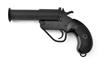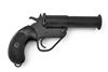 A 1in. (FLARE) SINGLE-SHOT SIGNAL-PISTOL, UNSIGNED, MODEL 'SCHERMULY'S PATENT', serial no. 8521, recent, with matt black finished 5 3/4in. iron barrel with flared end, break open frame, exposed hammer and chequered black plastic grips, in a vinyl carry-case