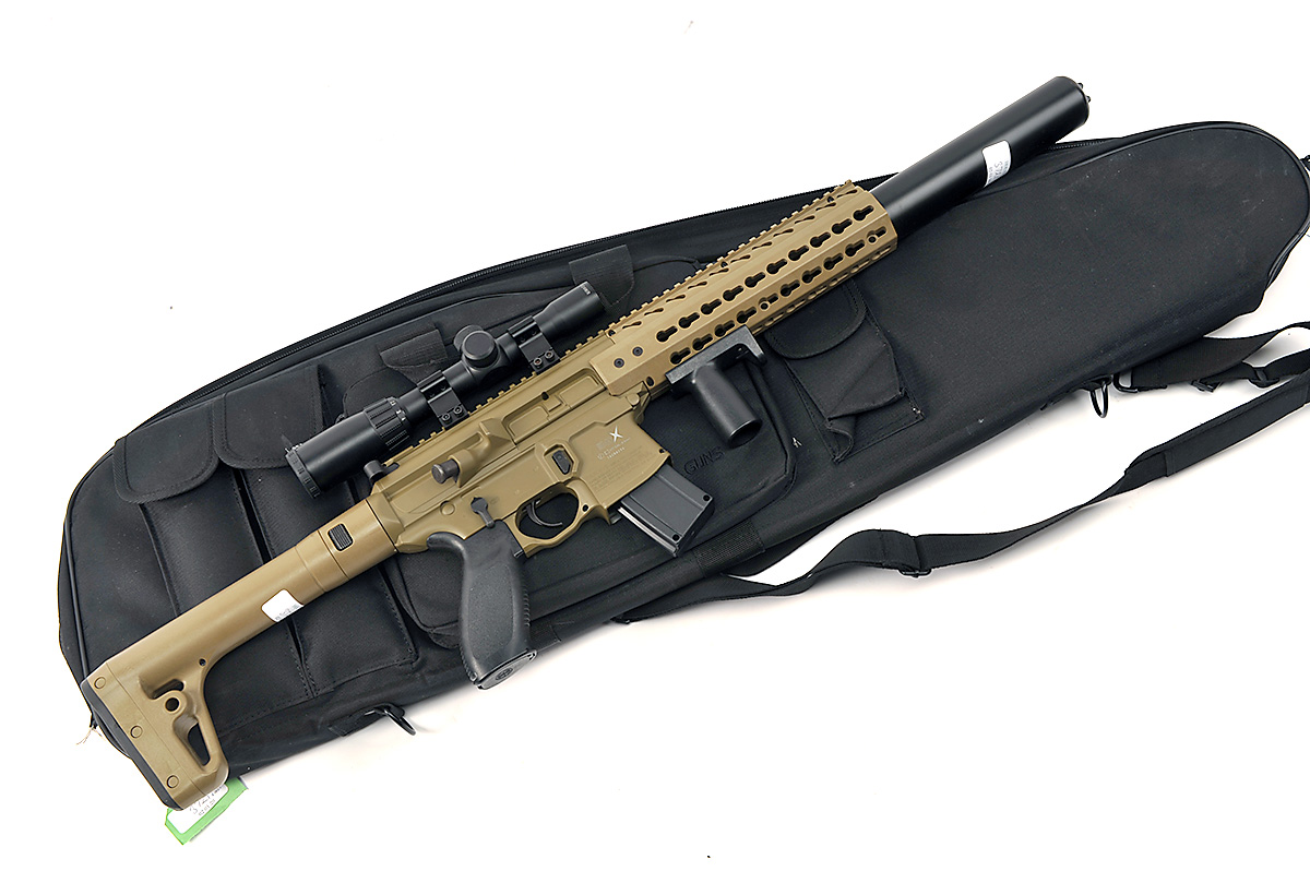 A BOXED .177 CO2-POWERED REPEATING AIR-RIFLE SIGNED SIG, MODEL 'MC', serial no. 16C04286, in imitation of the assault rifle of the same name, with 18in. barrel including dummy suppressor, desert paint finish receiver and butt-stock, detachable magazine, fitted with a SIG-SAUER 1-4x24 telescopic sight, three spare Umarex co2 cylinders, with its maker's card carton and a cordura gunbag