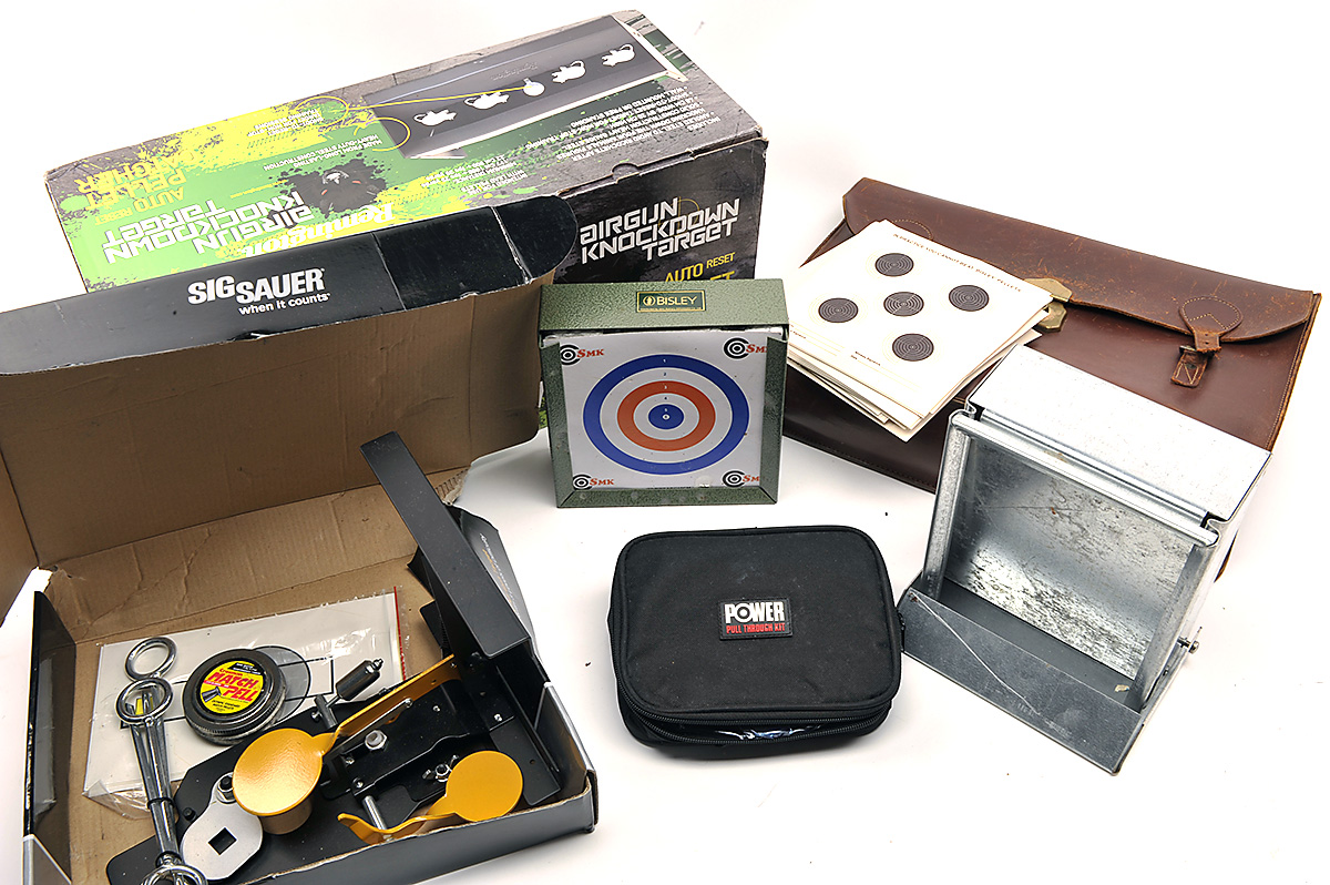 A COLLECTION OF AIR GUN ACCESSORIES, comprising of a Remington knockdown target, paper targets, aluminium target holder, air canisters