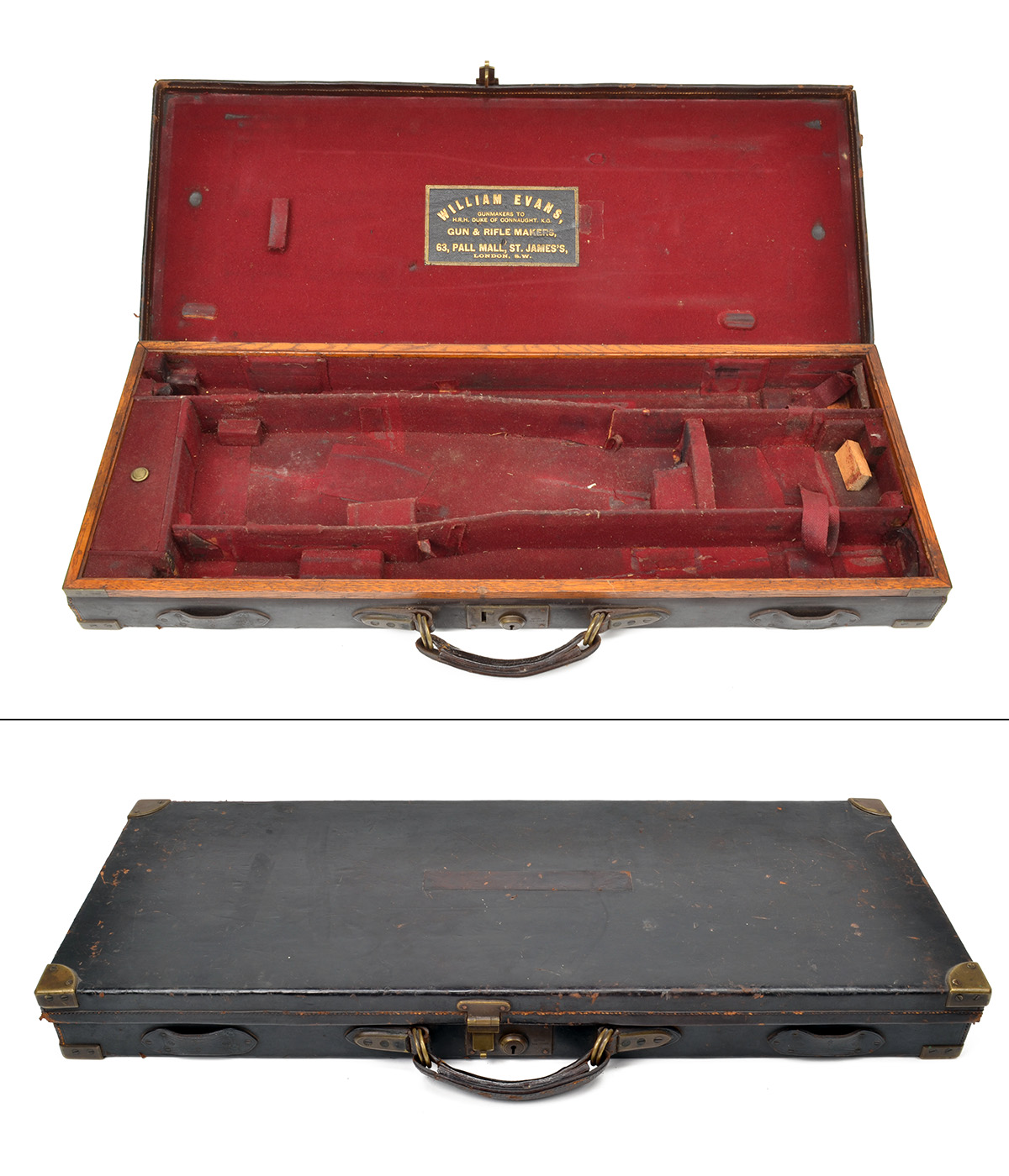 fitted for 30in. & 28in. barrels, the interior lined with red baize, a William Evans trade label, brass lock (key missing)