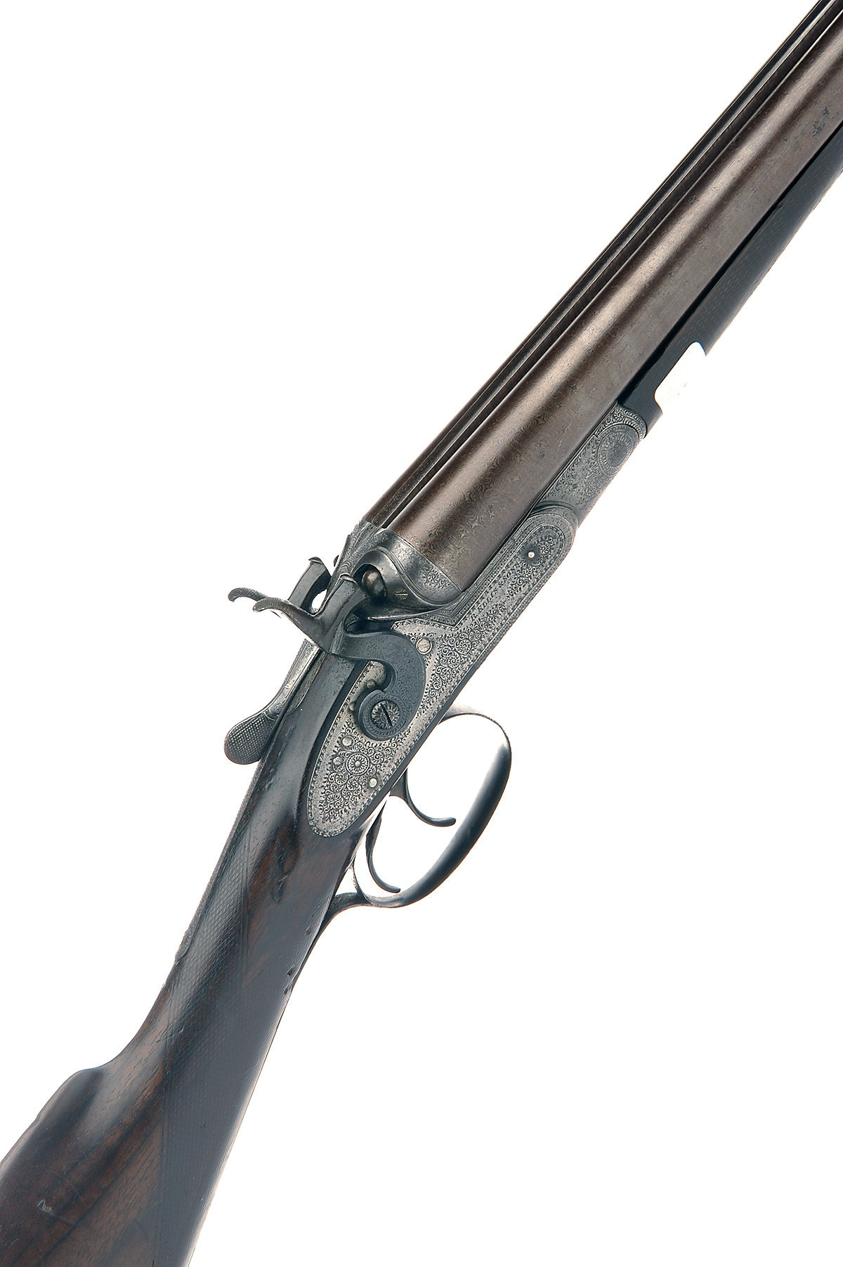 R. ELLIS & SONS 12-BORE TOPLEVER HAMMERGUN, serial no. 1338, 30in. black powder only reproved damascus barrels, the rib engraved 'RICHARD ELLIS & SONS. ST. MARY'S SQUARE. BIRMINGHAM.', 2 1/2in. chambers, bored approx. true cyl. and 1/4 choke, carved percussion fences, rebounding locks with carved faceted hammers, border and acanthus scroll engraving,14 1/2in. stock including buttplate (cracked at hand), weight 6lb. 11oz.