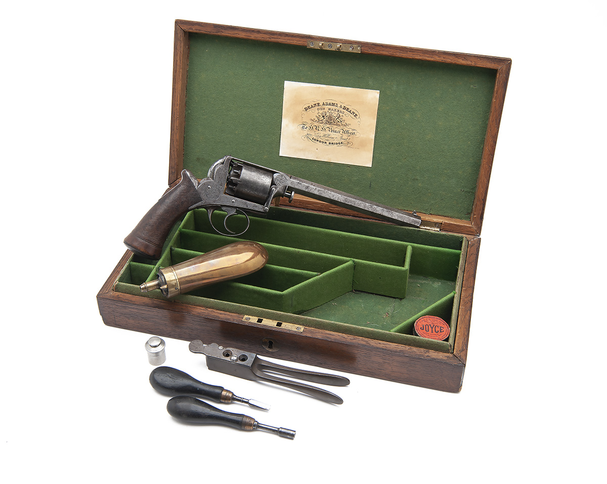 circa 1852, with octagonal 7 3/4in. barrel, the top- strap and flat signed 'DEANE ADAMS & DEANE (MAKERS TO H.R.H. PRINCE ALBERT) 30 KING WILLIAM ST'T LONDON BRIDGE', dove-tailed fore-sight, standing notch rear-sight, borderline and scroll engraved solid frame (detail rubbed), plain five-shot cylinder, spur-less hammer, guarded double action only trigger and chequered walnut semi saw-handled grip (worn smooth) with domed grip-cap and central trap-door, slight traces of original finish in sheltered areas and complete with its possible original oak case, relined and compartmented in green baize and containing a number of period accessories including a mould, flask, loading rod, turn-screw, nipple-key, oil bottle and cap-tin, with key
