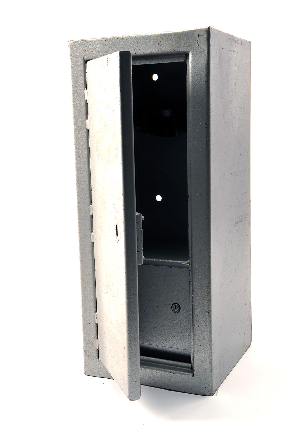 A STEEL PISTOL CABINET, measuring approx. 24in. x 10in. x 10in.
