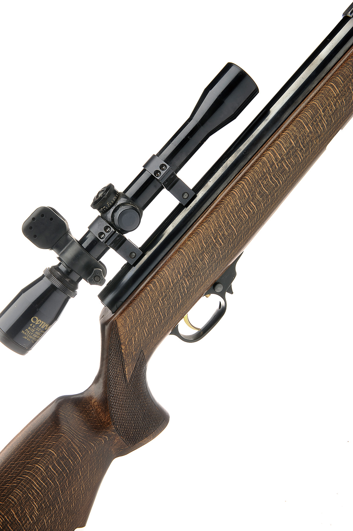 A .22 BREAK-BARREL GAS-RAM AIR-RIFLE SIGNED WEIHRAUCH, MODEL 'HW90', serial no. 1266605, with 16 1/2in. barrel including muzzle weight, blued air-chamber, beech half-stock and fitted with an OPTIMA 4x32 telescopic sight with torch bracket