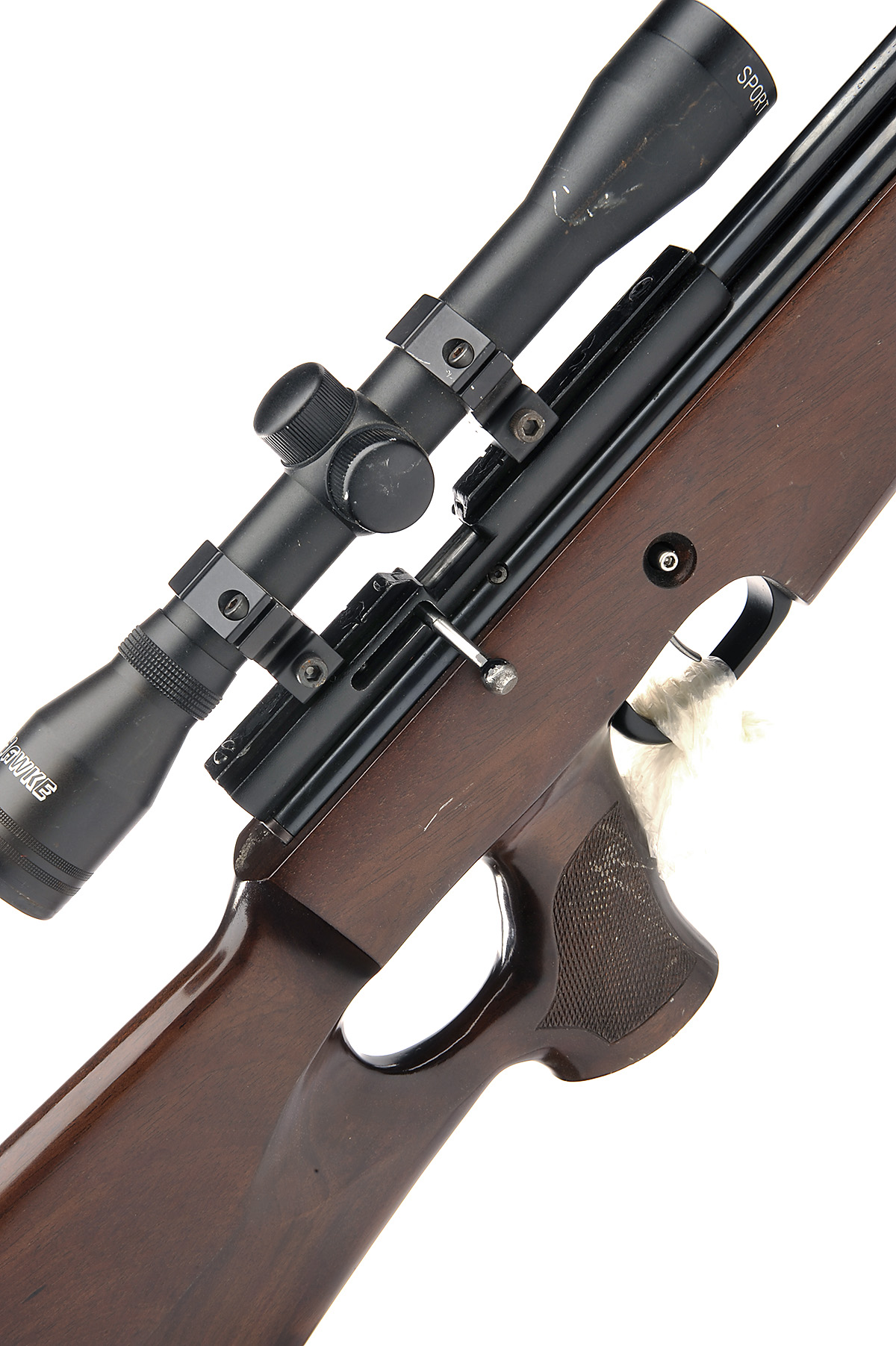 A .22 PRE-CHARGED PNEUMATIC AIR-RIFLE SIGNED AGS, MODEL 'PCR1', no visible serial number, with 25in. barrel including sound moderator, bolt action receiver, beech ambidextrous thumbhole three-quarter stock and under-barrel air reservoir (adapter included), fitted with a HAWKE 4x32 telescopic sight