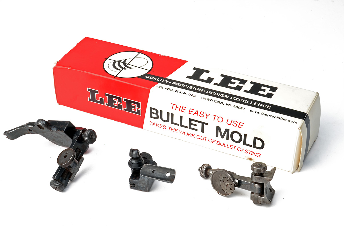 THREE VINTAGE ENGLISH RIFLE PEEP-SIGHTS TOGETHER WITH A MODERN BULLET MOULD, including one of each Parker Hale Model 5A, and PH16, together with a BSA Martini type and a Lee .41 cal 195grain mould with handles (4)