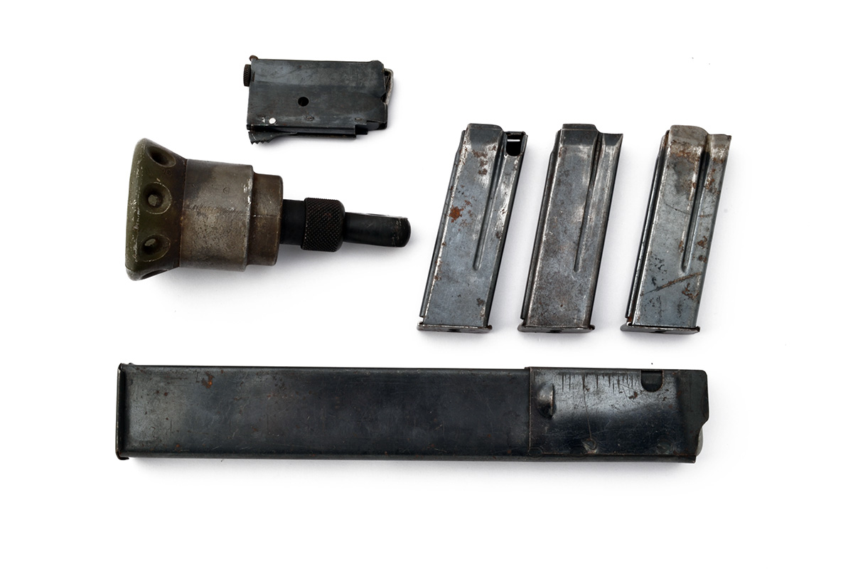 FIVE ASSORTED MAGAZINES, three possibly for the 1905/07 Savage pistol, one a .22 rifle magazine, also possibly Savage, the last for a sten-gun, together with a mystery object with sprung carabiner (6)