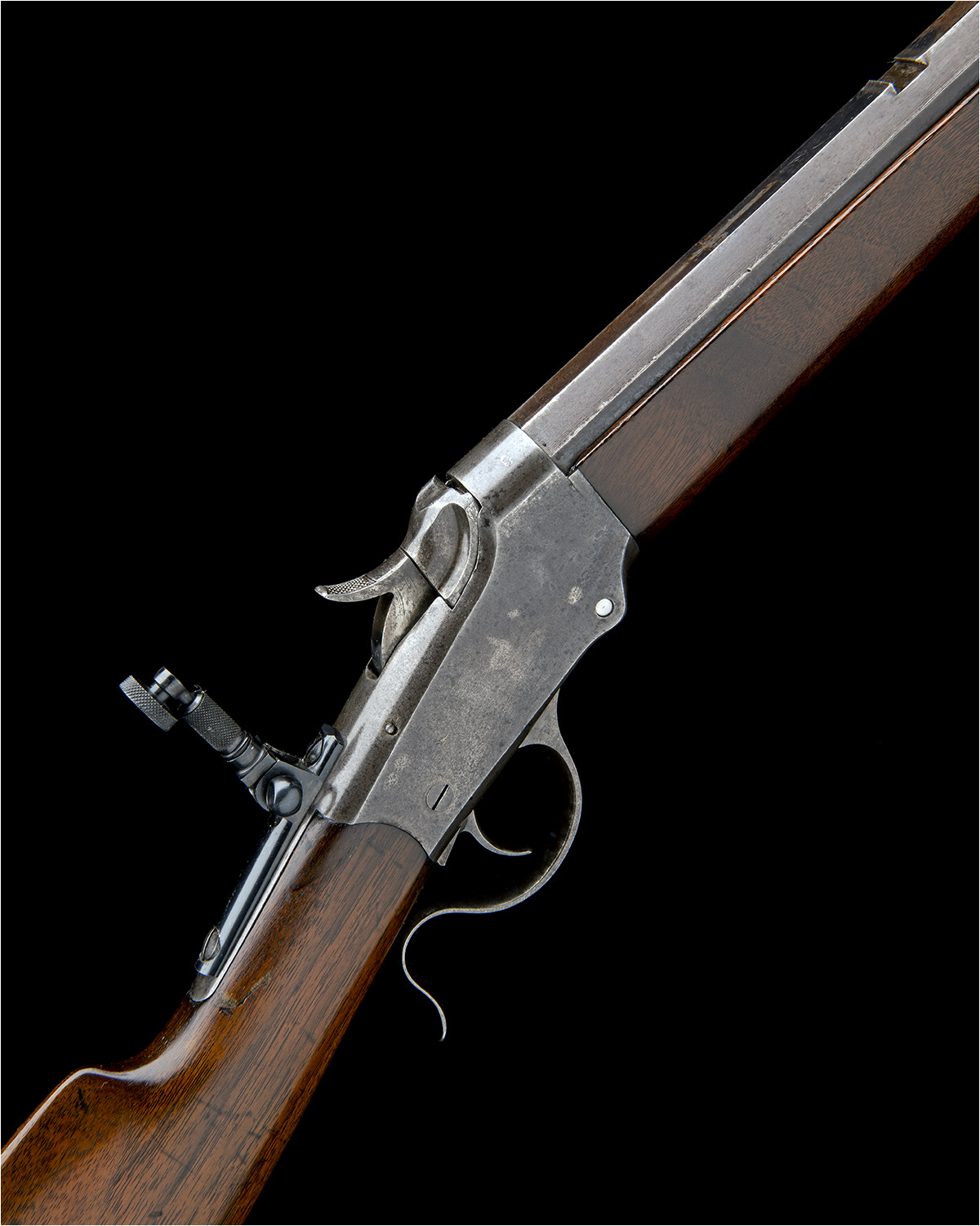 for 1888, with No.2 weight 26in. octagonal barrel originally chambered in .32 Long C/F but re-chambered in antiquity (recent re-proof), the top-flat signed 'MANUFACTURED BY THE WINCHESTER REPEATING ARMS CO. NEW HAVEN CONN. U.S.A.', nickel 'Rocky Mountain' fore-sight, dove-tail for rear-sight (absent), slab-sided low-wall action with central hammer, later elevating peep-sight to top-tang, walnut butt-stock with crescent heel-plate and walnut splinter fore-end with ebony schnabel tip