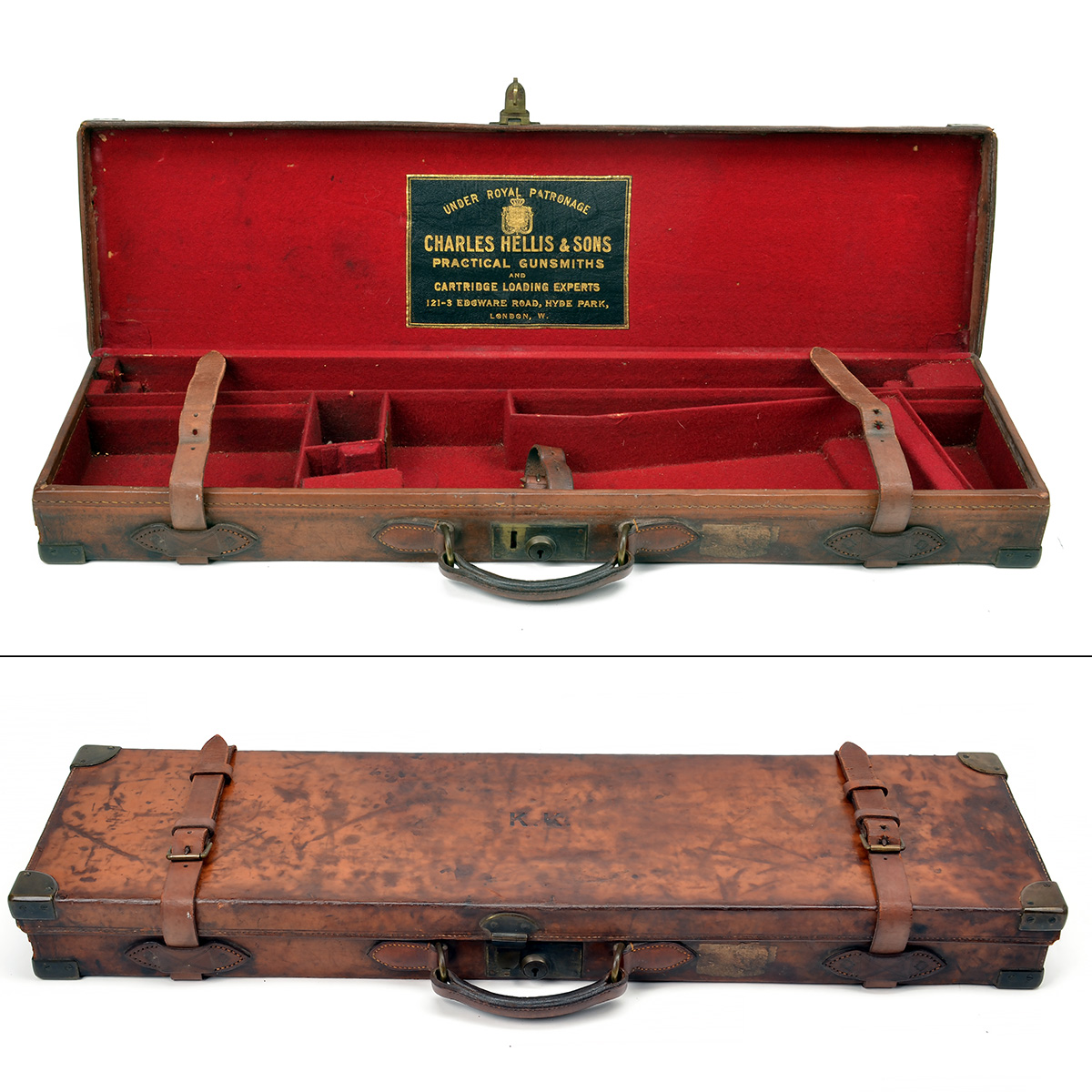 fitted 28in. barrels (could adapt to 30in. barrels, the interior lined with red baize, a leather gold-tooled Charles Hellis & Sons trade label, brass lock (key missing), the lid exterior with 'K.K.'