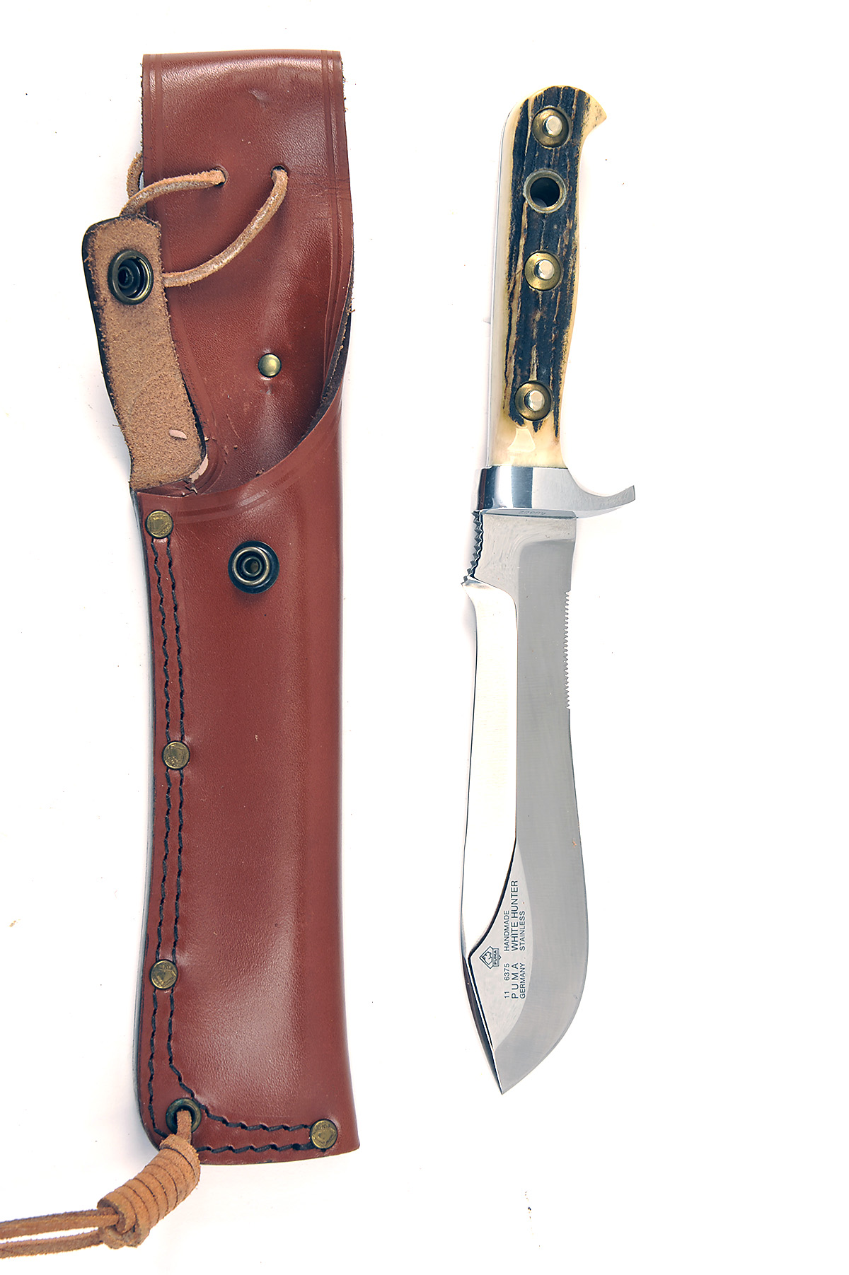 A BOXED HUNTING KNIFE SIGNED PUMA, MODEL 'WHITE HUNTER', serial no. 49392, unused, in its maker's carton with leather sheath