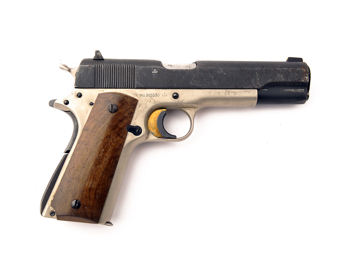 ** A .45 (ACP) CUSTOMISED SERVICE-PISTOL SIGNED COLT, MODEL '1911', serial no. 265530 / 246572C, originally for 1918, with polished 5in. barrel, blacked slide with hi visibility sights, satin chrome finished frame, smooth walnut grips, arched mainspring housing and gold plated trigger with later shoe