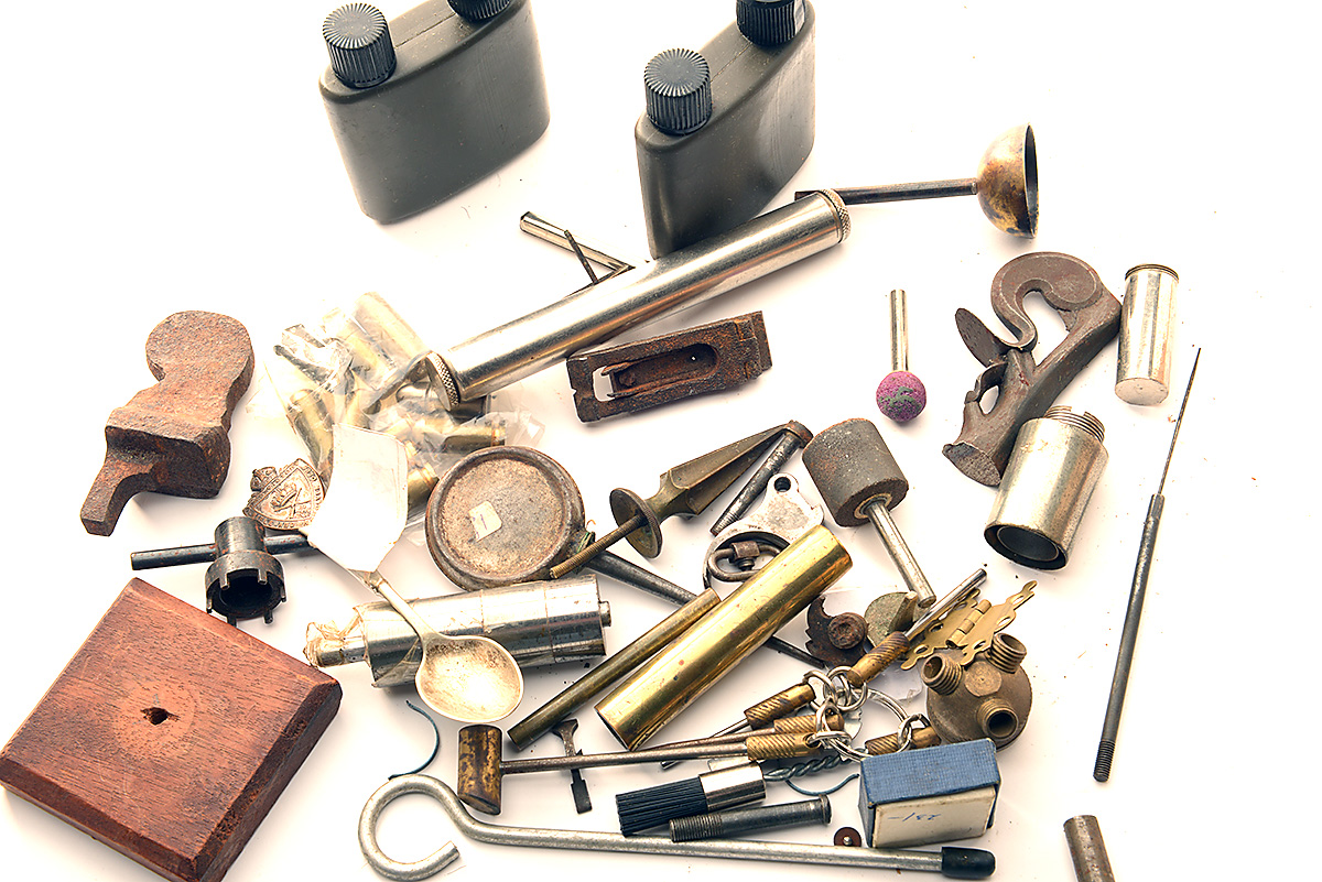 A COLLECTION OF VARIOUS GUN RELATED ITEMS, comprising of flintlock cock castings, vernier sights, HMS Victory club spoon, collars, choke key, tools