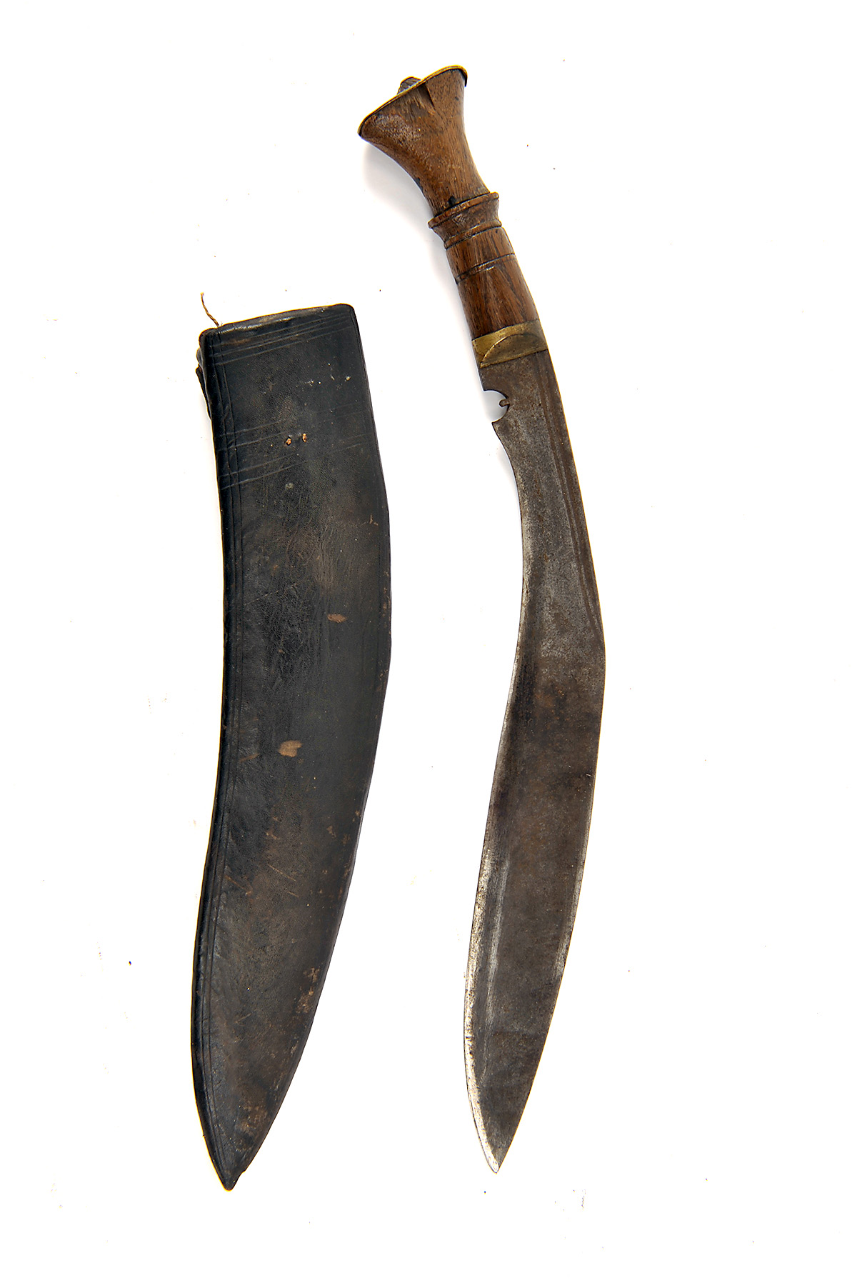 * A VINTAGE NEPALESE KUKRI KNIFE, late 19th to early 20th century, 12 1.2in. blade of classic profile, wood hilt, iron pommel-cap and complete with its leather scabbard with provision for bi-knives (absent)