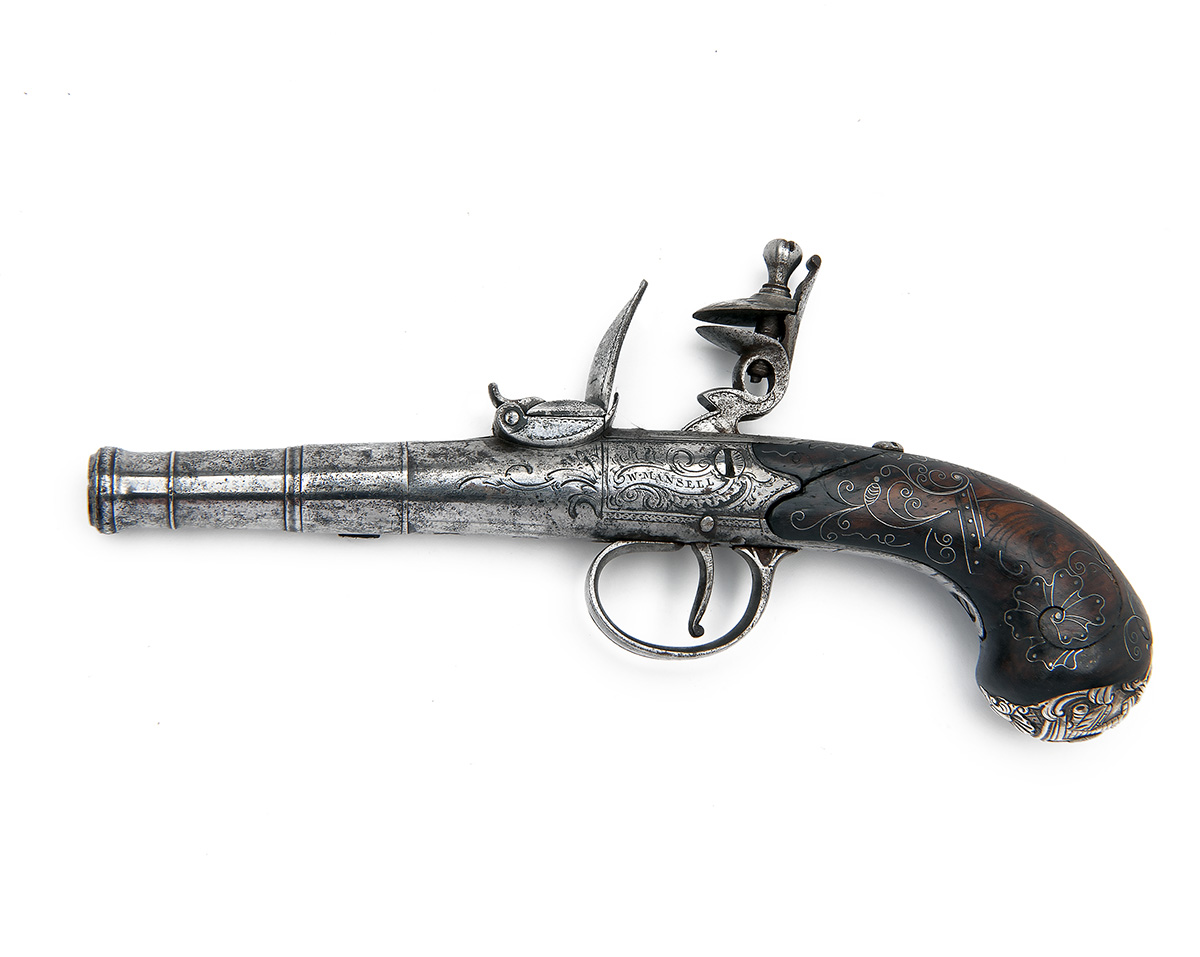 circa 1775, with multi-stage turn-off multigroove rifled 2 1/4in. cannon barrel, London proofs to underside of breech, scroll and trophy engraved rounded boxlock action signed in a banner on the left hand side 'W. MANSELL', pedestal pan, central cock, trigger-guard safe and bulbous walnut butt with wire scroll inlaid decoration and white metal butt-cap featuring a rampant lion above a ruined tower, butt cracked at head with loss to right top-side, top-nail replaced.