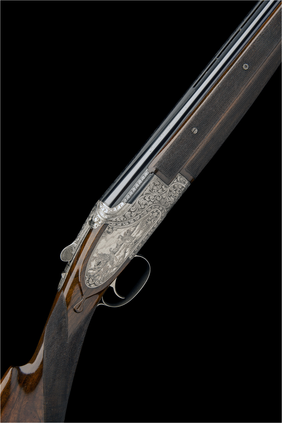 28in. nitro reproved barrels with 6mm ventilated matt top-rib, 2 3/4in. chambers, Teague multichokes (with spares), three-piece fore-end, hold-open toplever, automatic safety with integral barrel selector switch and gold 'S', 'O' and 'U' details, the action, sideplates and furniture carved in high relief with bold scrolling acanthus leaves on a finely stippled background, the sideplates with finely engraved game scenes of partridge in bulino style, the underside with a covey in flight in Browning 'Perdrix' style, bright finish, 14 5/8in. highly-figured roachbelly stock, weight 7lb. 5oz., in Browning faux fur-lined vinyl case