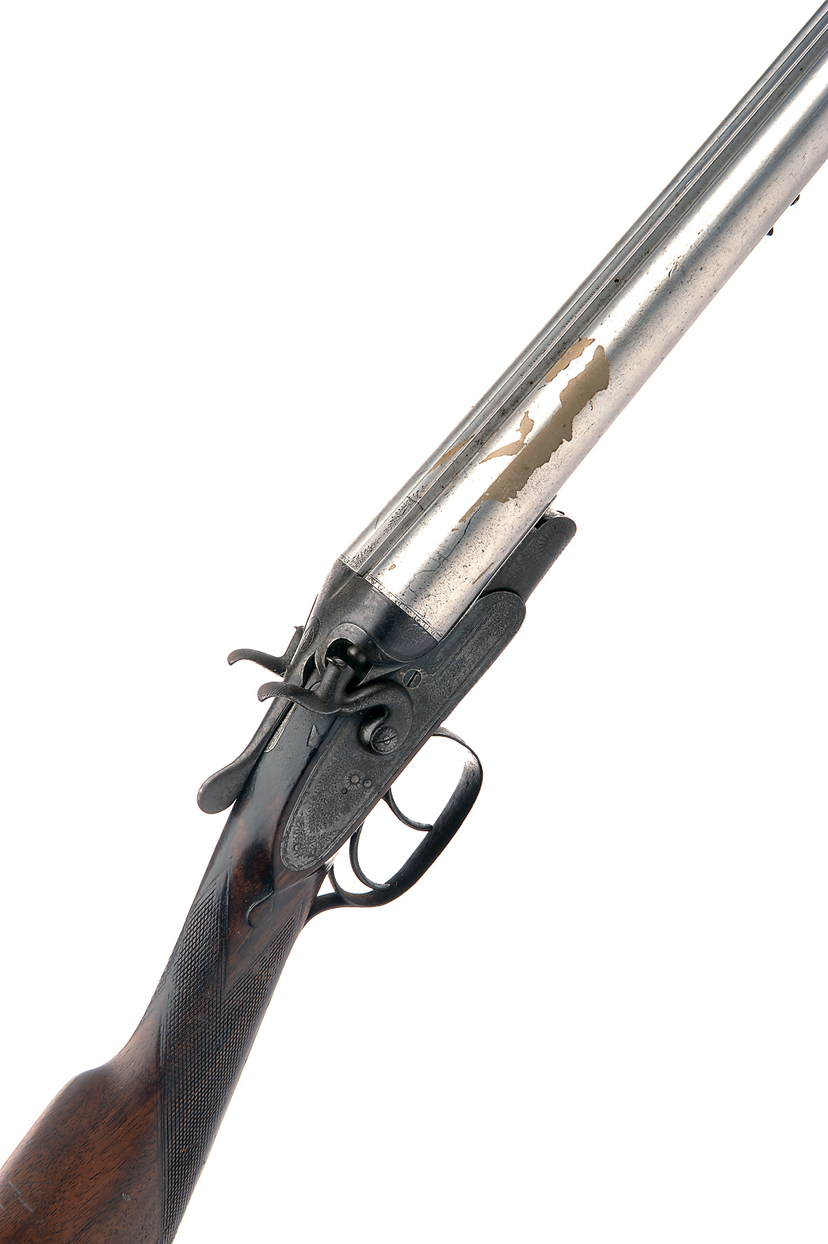 P. POWELL 12-BORE BRIGHTON 1887 PATENT TOPLEVER HAMMERGUN MISSING FORE-END, serial no. 43278, 30in. black powder only damascus barrels (struck off, pitted), the rib engraved 'P. POWELL. TONBRIDGE.', 2 1/2in. chambers, bored approx. true cyl. and 3/4 choke, action incorporating William Henry Brighton patent extractors, patent 10888 of 1887, use number 113, carved percussion fences with rebounding locks, border and acanthus scroll engraving, 14in. stock including buttplate, missing fore-end, in a wooden box