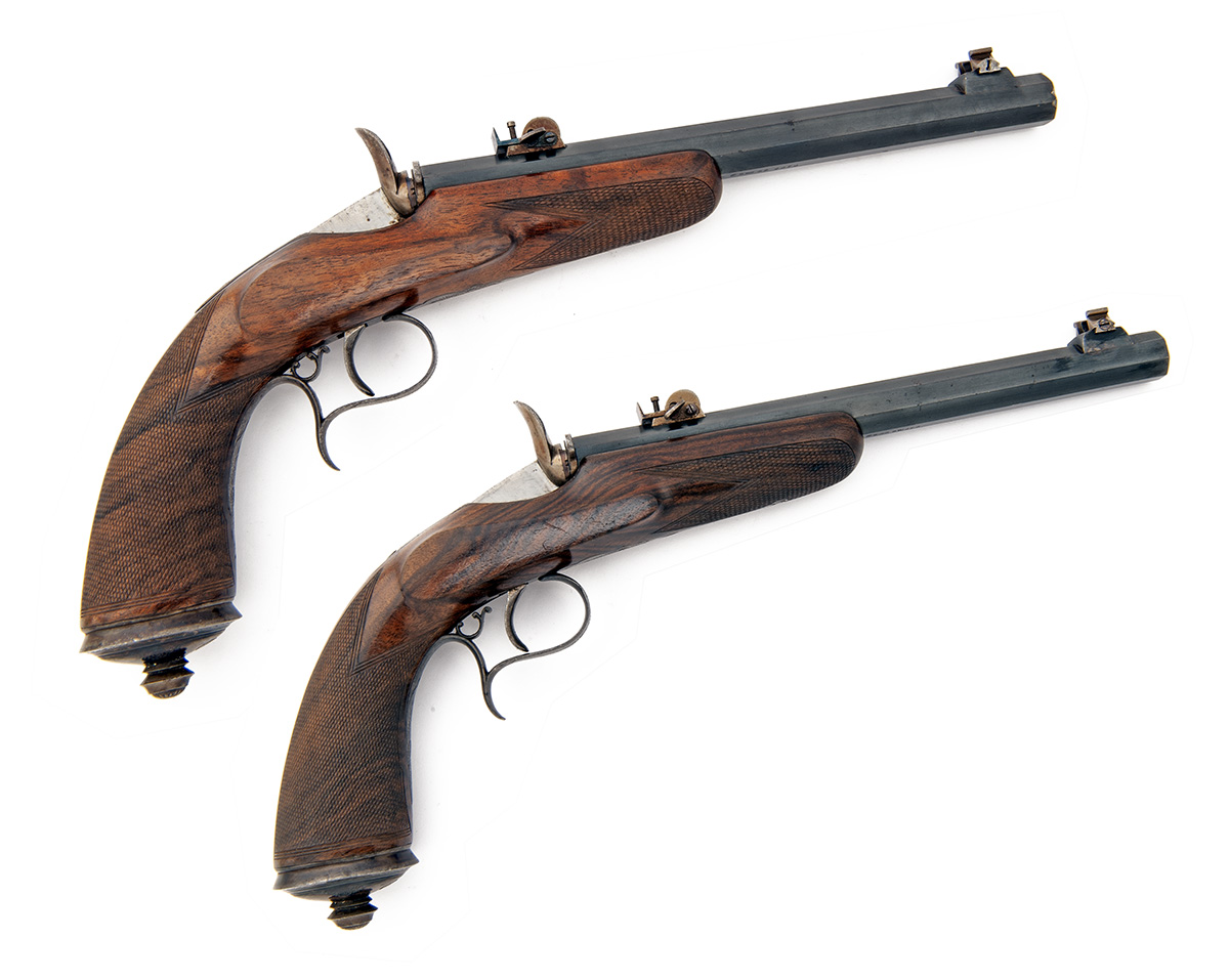 Belgian circa 1880, with blued octagonal heavy 9 1/2in. barrels, polished and dished muzzles, raised ramp with adjustable beaded blade fore-sights, elevating tangent rear-sight, central hammer with integral rolling breech, colour hardened frames, chequered walnut half-stocks with colour hardened butt-caps and spurred trigger-guards, plain triggers and much original finish throughout, complete with a walnut fitted case lined and compartmented in the Continental style for these pistols and a cleaning rod, circular depression for an ammunition tin, the inside of lid marked 'DEPOT DE PARIS, AMEDEE MAQUAIRE DIRECTEUR, 5 BOUL DE STRASBOURG', with key