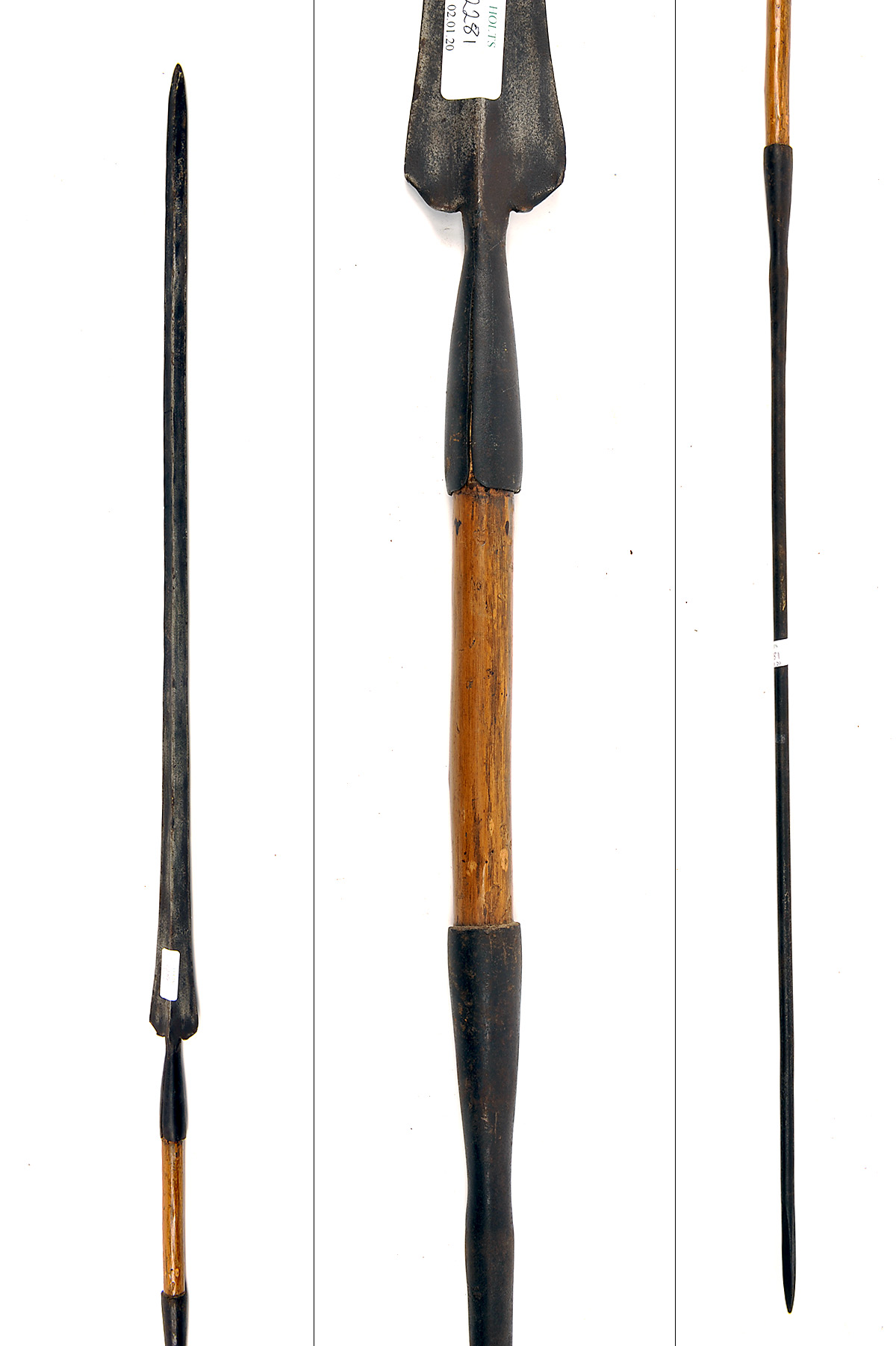 AN ANTIQUE MASAI BUFFALO-SPEAR, approximately 83in. overall with long socketed head and spiked tail, short wood grip joining the two pieces