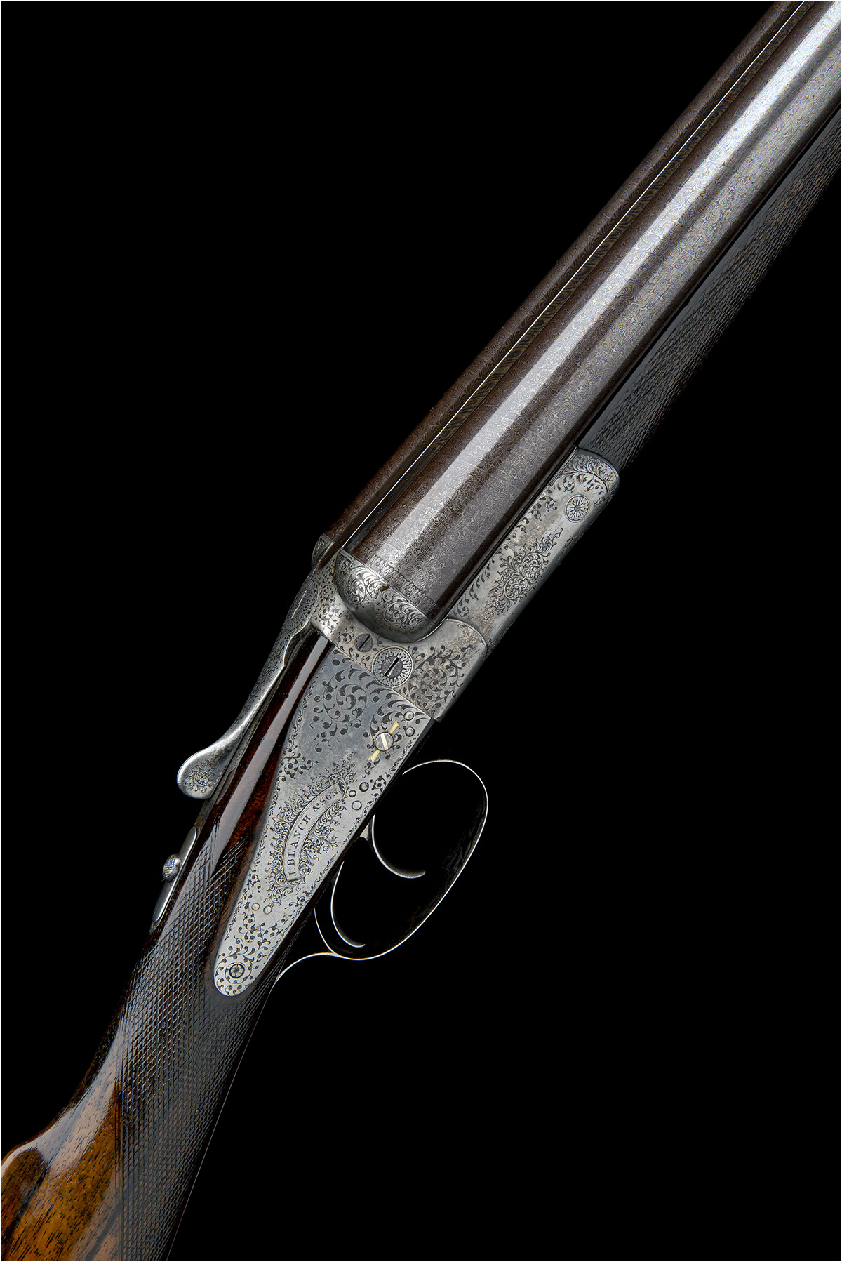 28in. nitro reproved fine damascus barrels, the rib engraved 'J. BLANCH & SON. 29 GRACECHURCH STREET. LONDON.', 2 1/2in. chambers, bored approx. 1/4 and 1/2 choke, treble-grip action with Scott patent gas check system, patent no. 617 of 1882, use number 3886, automatic safety with gold-inlaid 'SAFE' detail, gold-inlaid cocking-indicators, fine acanthus scroll engraving with stylised foliate fronds, retaining very slight traces of original colour-hardening and finish, 13 7/8in. stock, fore-end with 'J. BLANCH & SON'S IMPROVED SNAP BOLT' release lever, weight 6lb. 7oz., in a brass-cornered leather bound case with contemporary J. Blanch trade label