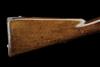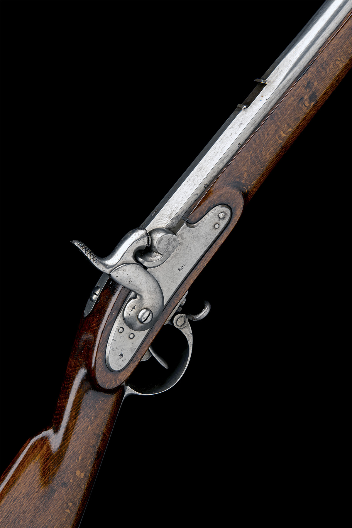 date coded for 1861, possibly converted from flintlock, with octagonal to round tapering iron 37 1/4in. rifled barrel, applied boat-shaped fore-sight, vacant dove-tail for rear-sight at breech-end, plain bevel-edged lock stamped with '861' for '1861', walnut three-quarter stock with heavy iron furniture, raised cheek-piece, brass-tipped iron ramrod and all matching numbers, in original 'in the white' finish