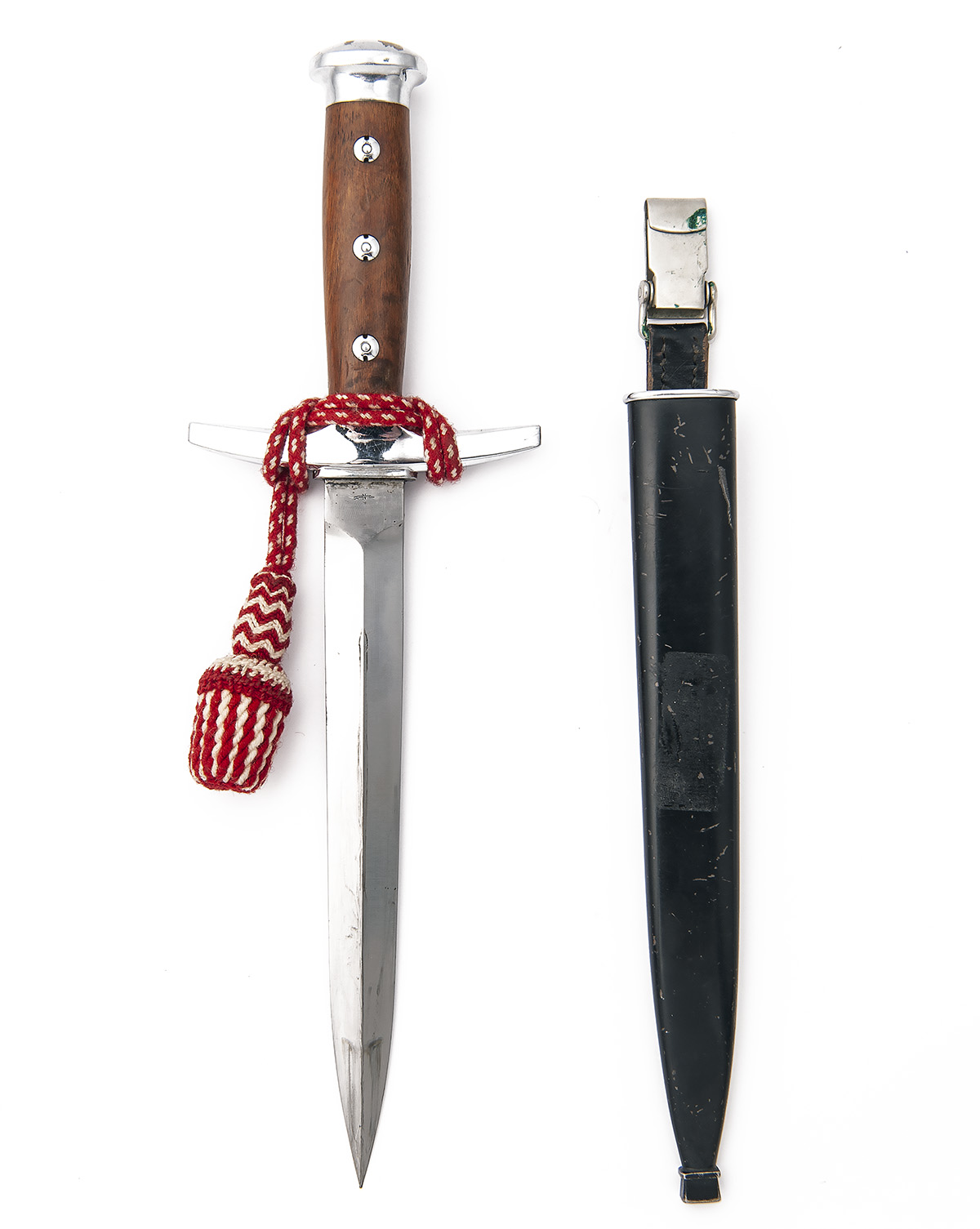 ** A SWISS M1943 DRESS DAGGER, serial no. 22430, with double edged 8 1/4in. blade, chromed hilt with wood scales and black painted scabbard, complete with hanger and portapee knot