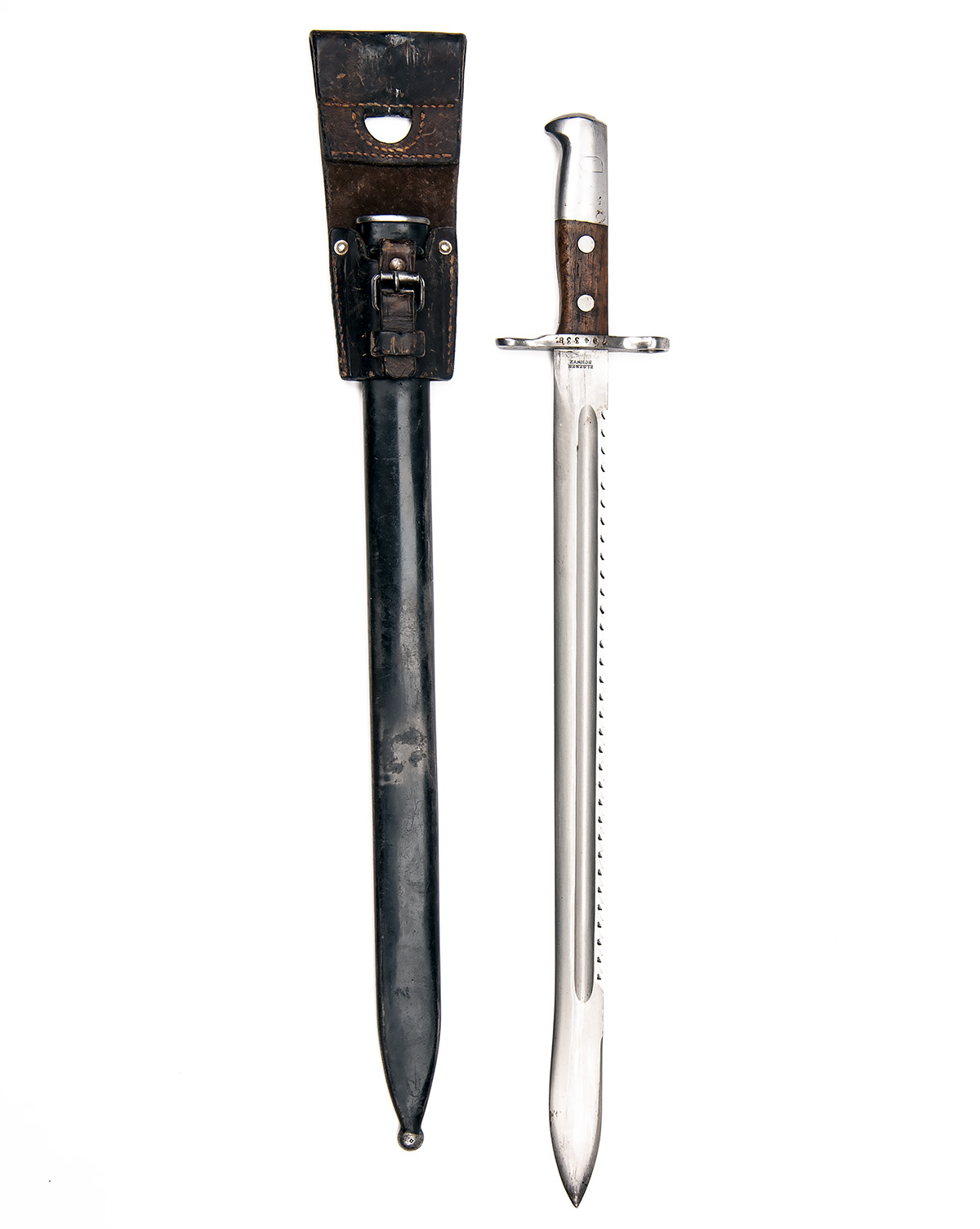 ** A SWISS M14 SAW-BACKED FASCHINEMESSER BAYONET FOR THE K11/K31 RIFLE, serial no. 794338, World War Two vintage and signed 'ELSENER SCHWYZ', with 18 5/8in. bolo-tipped blade, wood scales and complete with its blued steel scabbard and leather belt frog