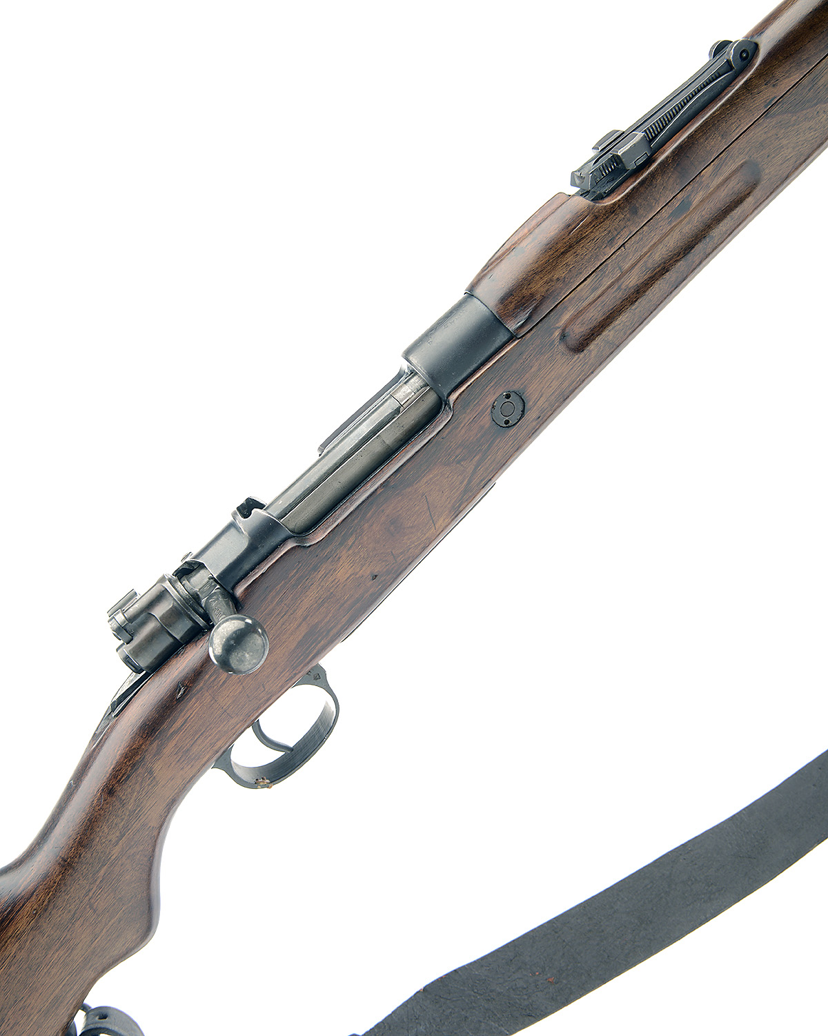 23 3/4in. nitro barrel, ramp-mounted fore-sight, tangent leaf rear-sight, graduated to 2000 meters, receiver ring with 'FABRICA DE ARMS LA CORUNA' with crest, manual flag safety, detachable floorplate, full-length semi-pistolgrip stock, leather sling