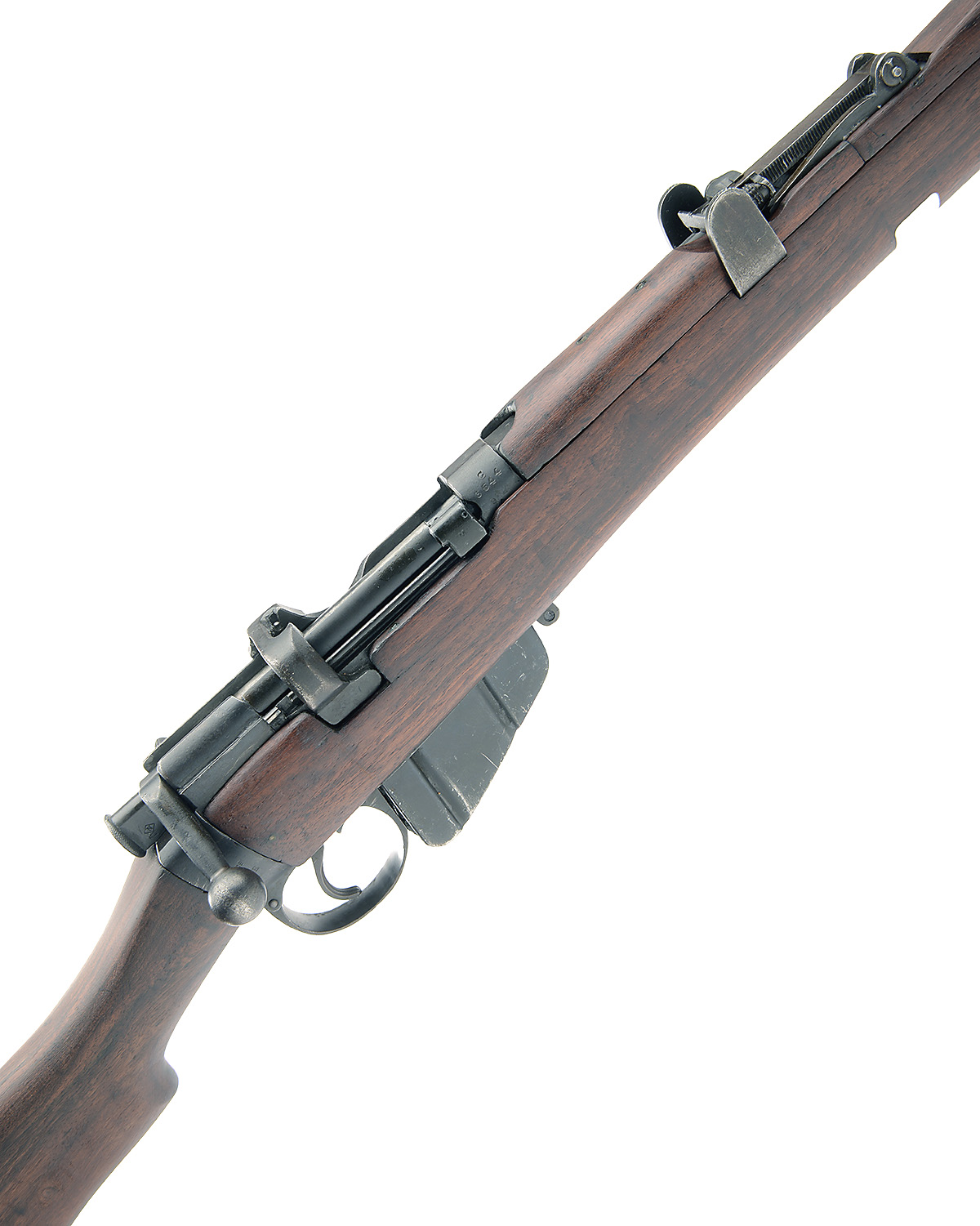 25 1/8in. nitro barrel, ramp-mounted fore-sight, tangent rear-sight, manual safety, action marked with 'G.R' cypher, 'B.S.A. CO. 1917 SHT.L.E. III*' detachable box magazine, well-figured full-length stock
