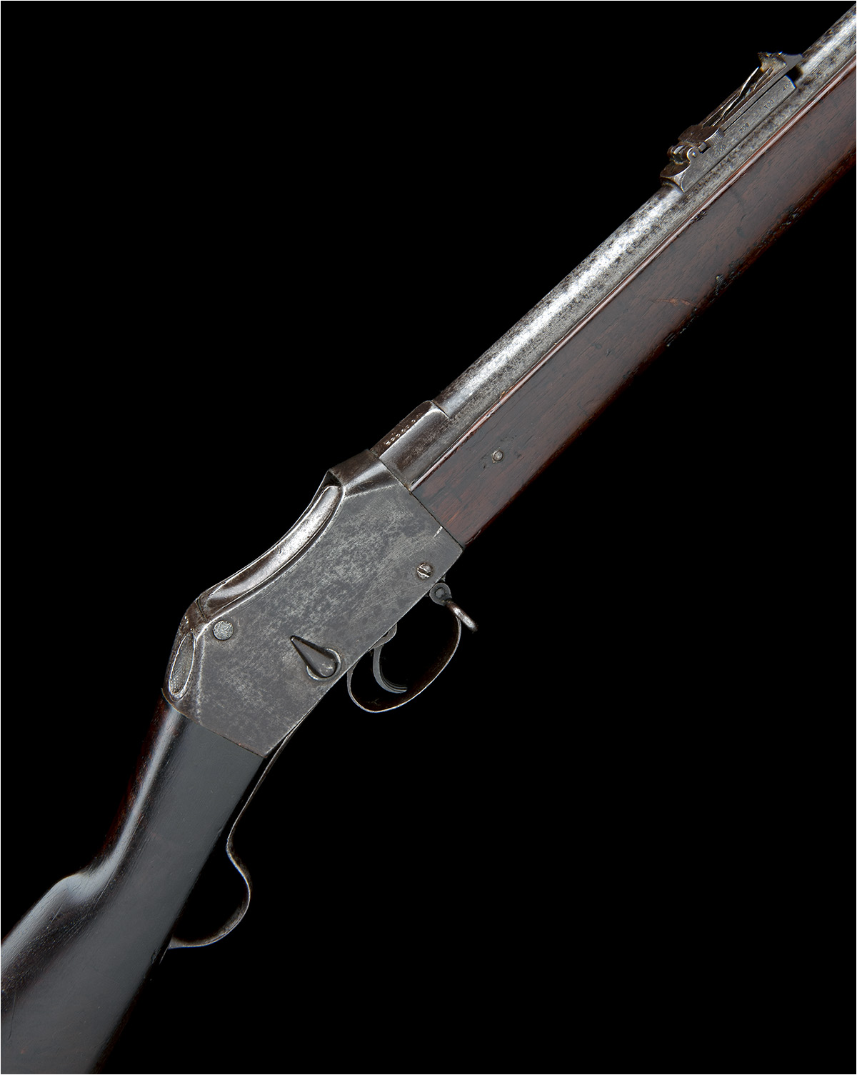 circa 1890, with 33 1/4in. barrel, block and blade fore-sight, elevating ladder rear-sight, the top of barrel signed 'McCARTHY RUCK & Co. LONDON', commercial proofs, plain slab-sided receiver with tear-drop cocking indicator and chequered thumb depression, walnut butt-stock, iron furniture including short under-lever and two barrel-bands and provision for clearing-rod (missing)