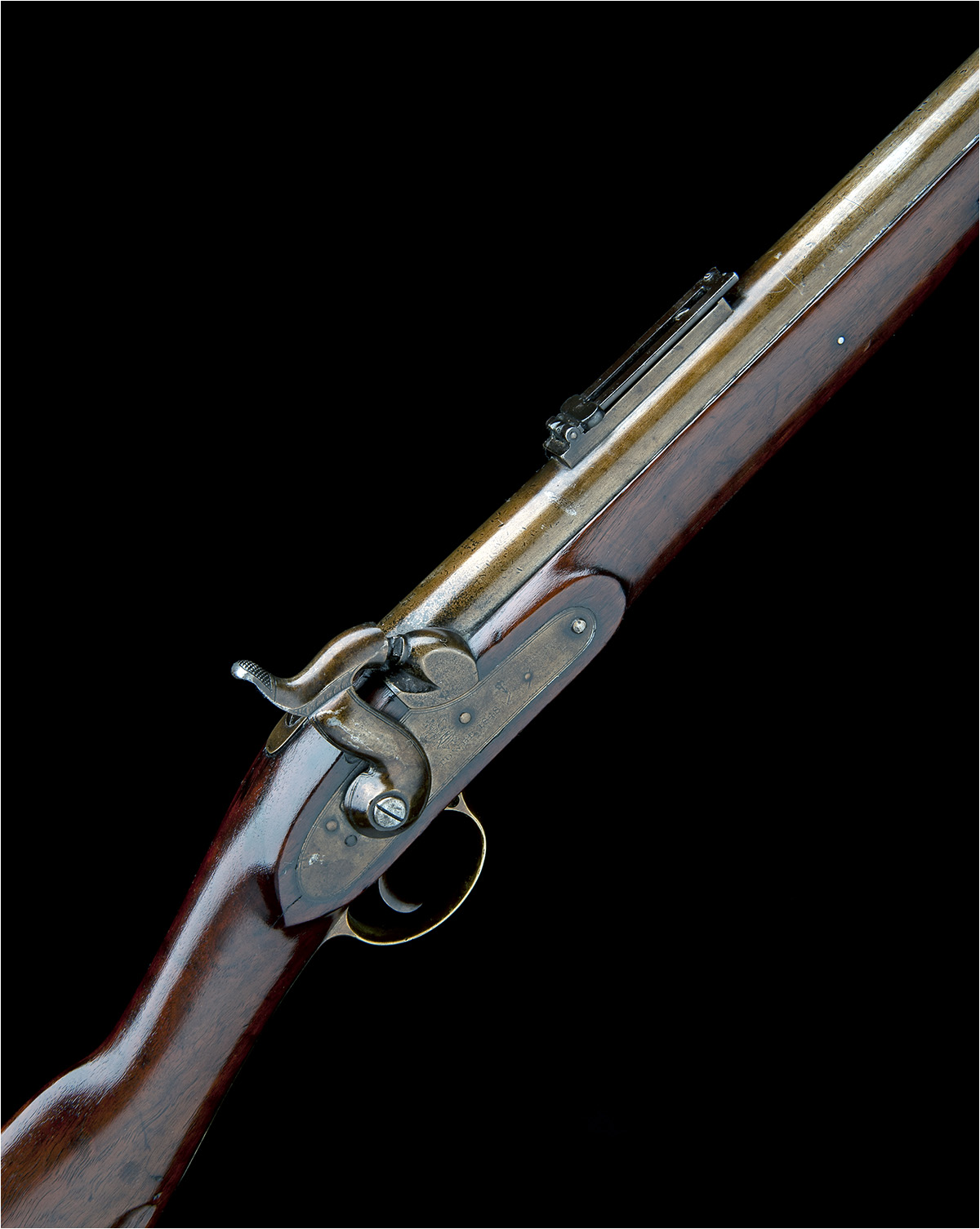 dated for 1848, with round iron 39in. barrel, block and blade fore-sight, replacement elevating ladder rear-sight, solid top-tang, borderline engraved lock marked with a 'V.R.' crown device, walnut three-quarter stock, brass furniture, the muzzle-cap fitted with 'Lovell's' bayonet catch and complete with iron ramrod (some old deep scars to butt)