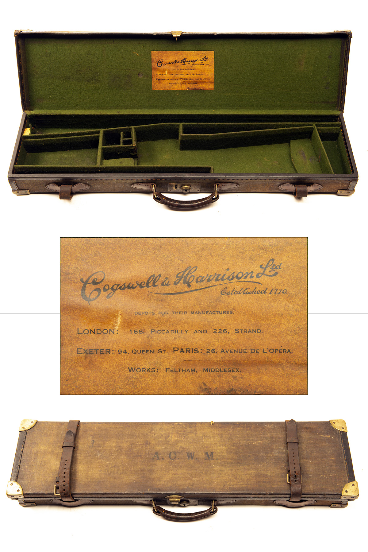 fitted for 30in. barrels, the interior lined with green baize, a Cogswell & Harrison trade label, brass lock (key missing)