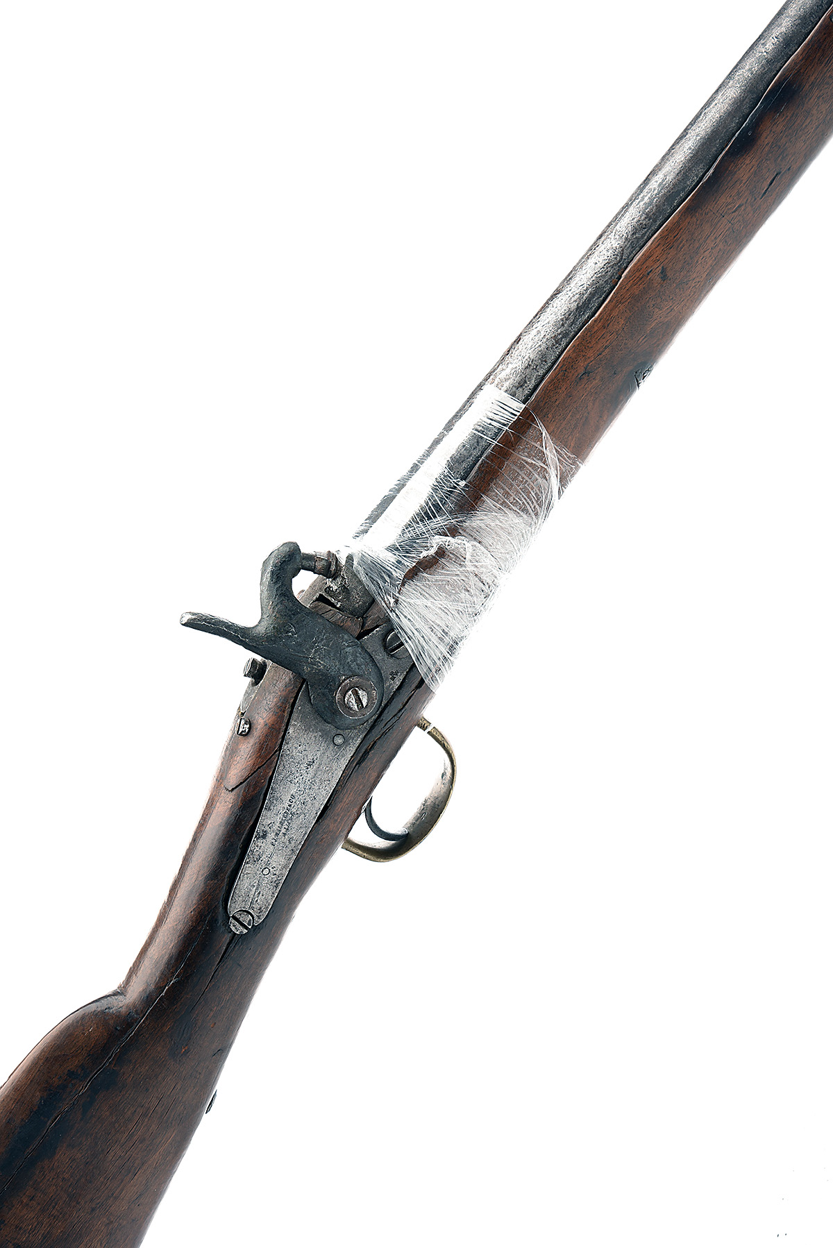 circa 1845, with 32 1/2in. barrel, back action lock (remainder of signature obscured) and walnut full-stock with brass furniture, worn throughout, trigger guard bow loose but present